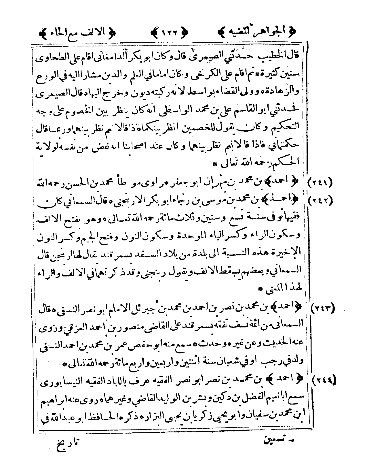 243 - أَحْمد بن مُحَمَّد بن نصر بن أَحْمد بن مُحَمَّد بن جبرئل الإِمَام أَبُو نصر النَّسَفِيّ قَالَ السَّمْعَانِيّ من أَئِمَّة نسف تفقه بسمرقند على القَاضِي مَنْصُور بن أَحْمد العزقي وروى عَنهُ الحَدِيث وَعَن غَيره وَحدث سمع مِنْهُ أَبُو حَفْص عمر بن مُحَمَّد بن أَحْمد النَّسَفِيّ ولد فى رَجَب أَو فى شعْبَان سنة اثْنَتَيْنِ وَأَرْبَعين وَأَرْبع مائَة رَحمَه الله تَعَالَى