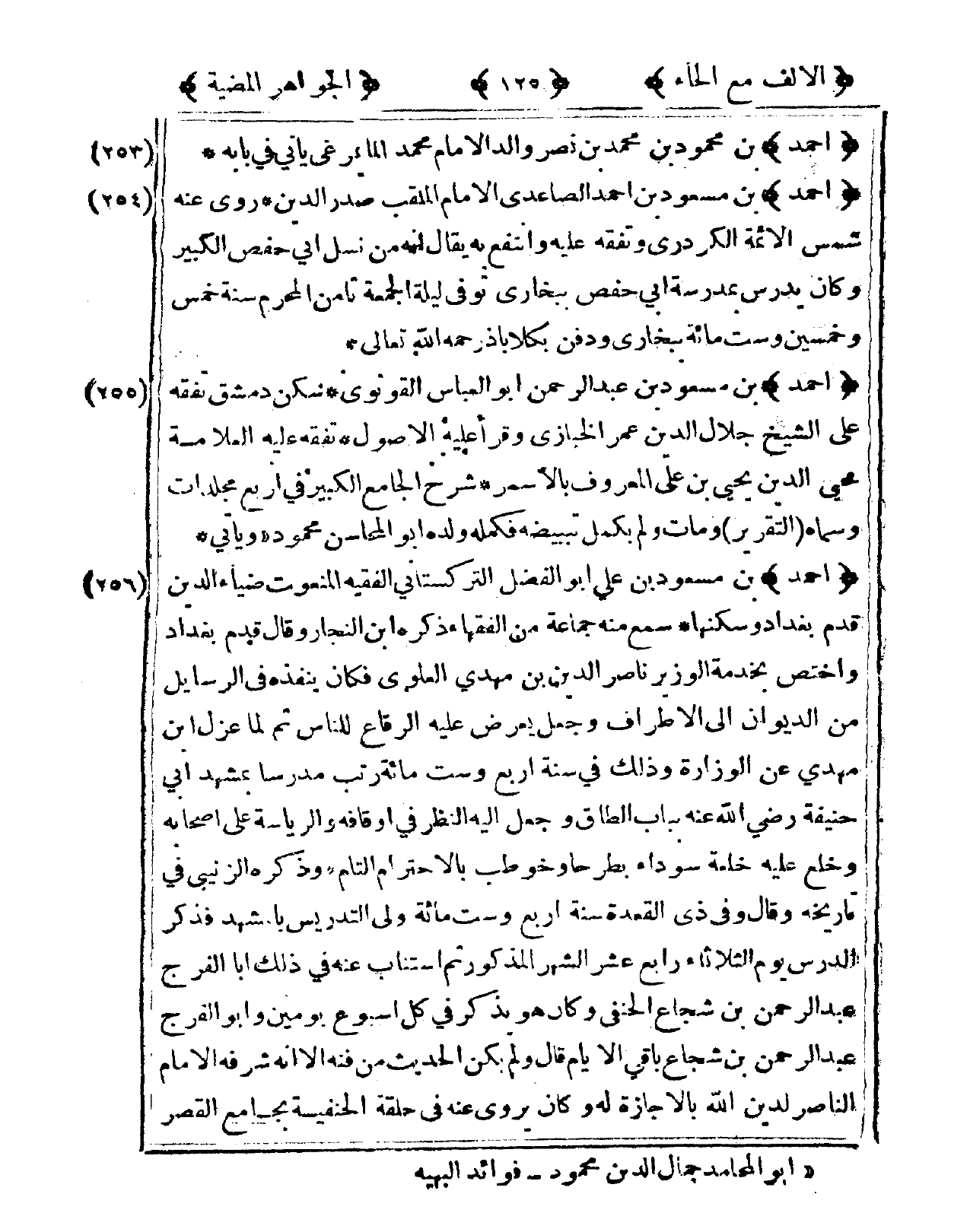 255 - أَحْمد بن مَسْعُود بن عبد الرَّحْمَن أَبُو الْعَبَّاس القونوي سكن دمشق تفقه على الشَّيْخ جلال الدّين عمر الْخَبَّازِي وَقَرَأَ عَلَيْهِ الْأُصُول تفقه عَلَيْهِ الْعَلامَة محيى الدّين يحيى بن عَليّ الْمَعْرُوف بالاسمر شرح الْجَامِع الْكَبِير فى أَربع مجلدات وَسَماهُ التَّقْرِير وَمَات وَلم يكمل تبيضه فكمله وَلَده أَبُو المحاسن مَحْمُود وَيَأْتِي