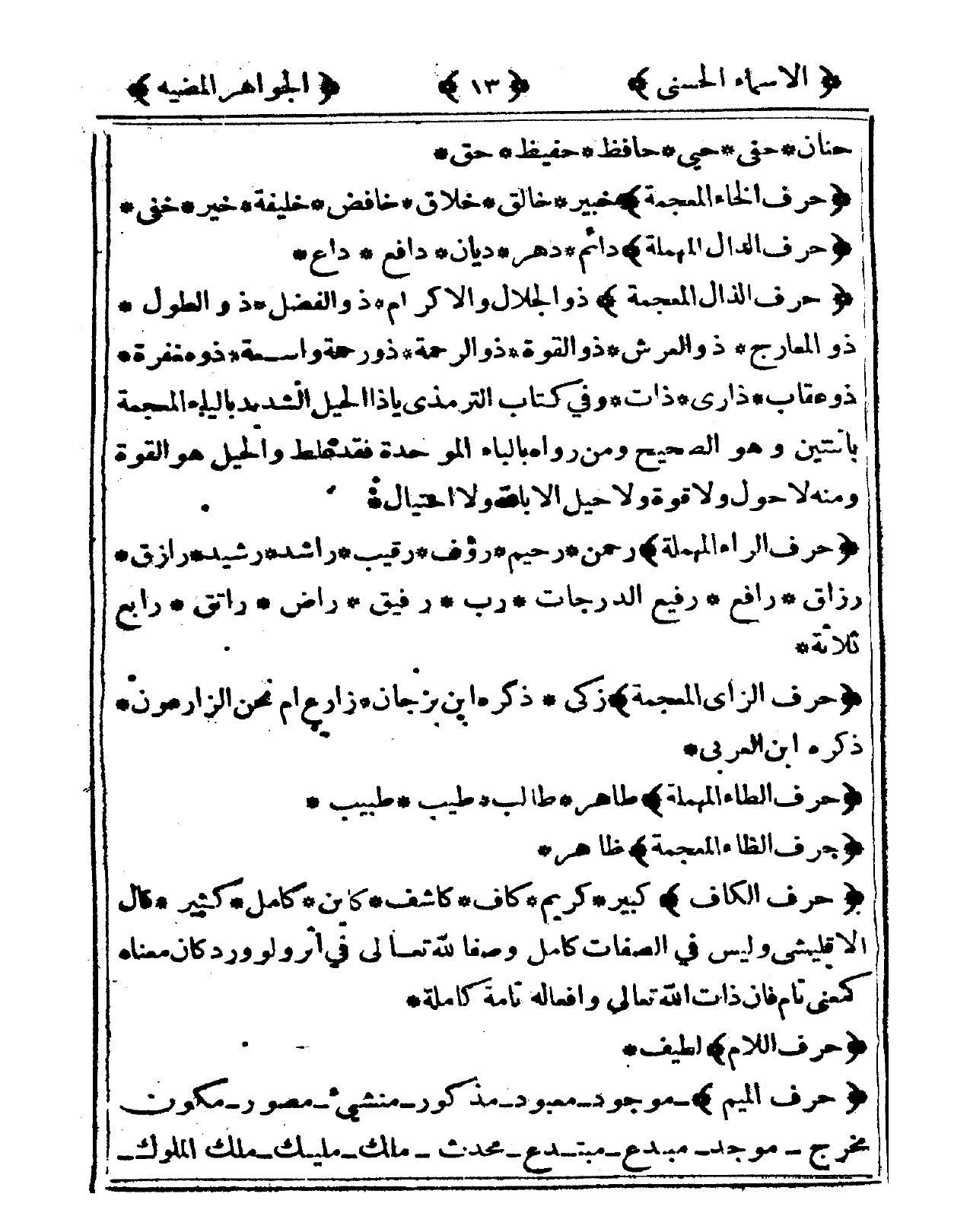 حرف الذَّال الْمُعْجَمَة ذُو الْجلَال وَالْإِكْرَام ذُو الْفضل ذُو الطول ذُو المعارج ذُو الْعَرْش ذُو الْقُوَّة ذُو الرَّحْمَة ذُو رَحْمَة وَاسِعَة ذُو مغْفرَة ذُو عِقَاب ذاري ذَات وفى كتاب التِّرْمِذِيّ يَاذَا الْحِيَل الشَّديد بِالْيَاءِ الْمُعْجَمَة باتنتين وَهُوَ الصَّحِيح وَمن رَوَاهُ بِالْبَاء الْمُوَحدَة فقد غلط والحيل هُوَ الْقُوَّة وَمِنْه لَا حول وَلَا قُوَّة وَلَا حيل إِلَّا بِاللَّه وَلَا احتيال