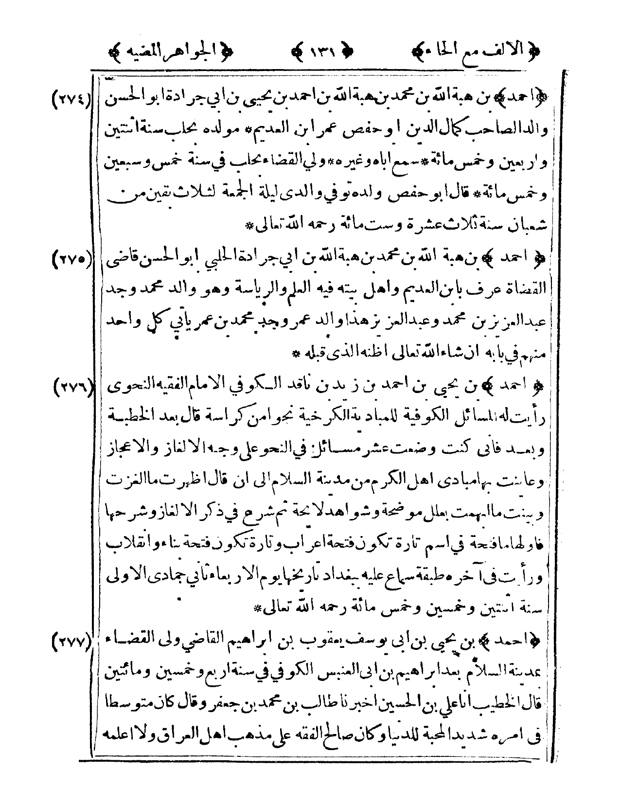 274 - أَحْمد بن هبة الله بن مُحَمَّد بن هبة الله بن أَحْمد بن يحيى بن أبي جَرَادَة أَبُو الْحسن وَالِد الصاحب كَمَال الدّين أَبُو حَفْص عمر ابْن العديم مولده بحلب سنة اثْنَتَيْنِ وَأَرْبَعين وَخمْس مائَة سمع أَبَاهُ وَغَيره ولي الْقَضَاء بحلب فى سنة خمس وَسبعين وَخمْس مائَة قَالَ أَبُو حَفْص وَلَده توفّي وَالِدي لَيْلَة الْجُمُعَة لثلاث بَقينَ من شعْبَان سنة ثَلَاث عشرَة وست مائَة رَحمَه الله تَعَالَى