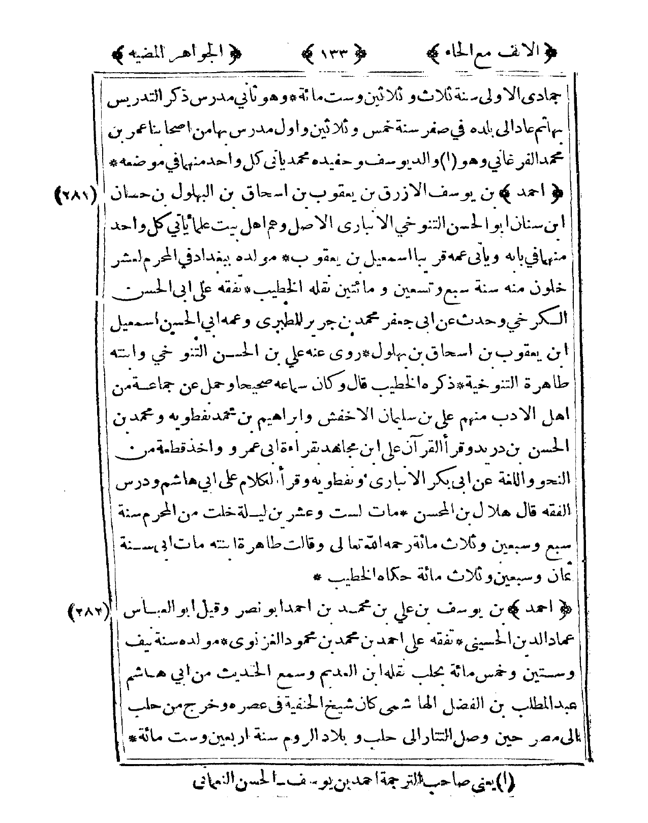 281 - أَحْمد بن يُوسُف الْأَزْرَق بن يَعْقُوب بن إِسْحَاق بن البهلول بن حسان ابْن سِنَان أَبُو الْحسن التنوخي الْأَنْبَارِي الأَصْل وهم أهل بَيت عُلَمَاء يَأْتِي كل وَاحِد مِنْهُمَا فى بَابه وَيَأْتِي عَمه قَرِيبا إِسْمَعِيل بن يَعْقُوب مولده بِبَغْدَاد فى الْمحرم لعشر خلون مِنْهُ سنة سبع وَتِسْعين وَمِائَتَيْنِ نَقله الْخَطِيب تفقه على أبي الْحسن الْكَرْخِي وَحدث عَن أبي جَعْفَر مُحَمَّد بن جرير الطَّبَرِيّ وَعَمه أبي الْحسن إِسْمَعِيل ابْن يَعْقُوب بن إِسْحَاق بن بهْلُول روى عَنهُ عَليّ بن الْحسن التنوخي وَابْنَته طَاهِرَة التنوخية ذكره الْخَطِيب قَالَ وَكَانَ سَمَاعه صَحِيحا وَحمل عَن جمَاعَة من أهل الْأَدَب مِنْهُم عَليّ بن سُلَيْمَان الْأَخْفَش وَإِبْرَاهِيم بن مُحَمَّد نفطويه وَمُحَمّد بن الْحسن بن دُرَيْد وَقَرَأَ الْقُرْآن على ابْن مُجَاهِد بِقِرَاءَة أبي عَمْرو وَأخذ قِطْعَة من النَّحْو واللغة عَن أبي بكر الْأَنْبَارِي ونفطويه وَقَرَأَ الْكَلَام على أبي هَاشم ودرس الْفِقْه قَالَ هِلَال بن المحسن مَاتَ لست وَعشْرين لَيْلَة خلت من الْمحرم سنة سبع وَسبعين وَثَلَاث مائَة رَحمَه الله تَعَالَى وَقَالَت طَاهِرَة ابْنَته مَاتَ أبي سنة ثَمَان وَسبعين وَثَلَاث مائَة حَكَاهُ الْخَطِيب