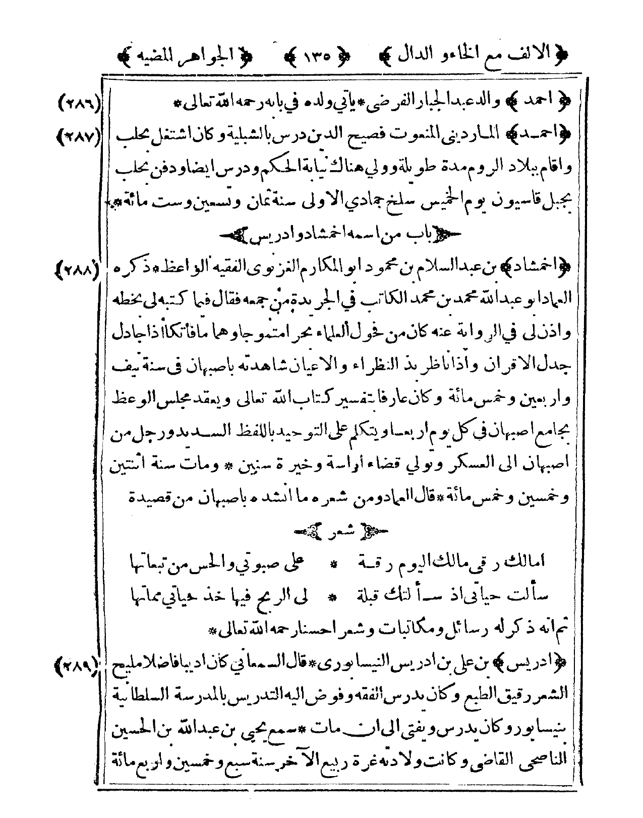 288 - أخمشاد بن عبد السَّلَام بن مَحْمُود أَبُو المكارم الغزنوي الْفَقِيه الْوَاعِظ ذكره الْعِمَاد أَبُو عبد الله مُحَمَّد بن مُحَمَّد الْكَاتِب فى الجريدة من جمعه فَقَالَ فِيمَا كتبه لي بِخَطِّهِ وَأذن لي فى الرِّوَايَة عَنهُ كَانَ من فحول الْعلمَاء بحرا متموجا وهما مَا فاتكا إِذا جادل جدل الأقران وَإِذا نَاظر بذ النظراء والأعيان شاهدته بأصبهان فى سنة نَيف وَأَرْبَعين وَخمْس مائَة وَكَانَ عَارِفًا بتفسير كتاب الله تَعَالَى ويعقد مجْلِس الْوَعْظ بِجَامِع أَصْبَهَان فى كل يَوْم أربعاء وَيتَكَلَّم على التَّوْحِيد بِاللَّفْظِ السديد ورحل من أَصْبَهَان إِلَى الْعَسْكَر وَتَوَلَّى قَضَاء أراسة وخيرة سِنِين وَمَات سنة إثنتين وَخمسين وَخمْس مائَة قَالَ الْعِمَاد وَمن شعره مَا أنْشدهُ بأصبهان من قصيدة شعر ... أمالك رقي مَالك الْيَوْم رقة ... على صبوتي والحس من تبعاتها