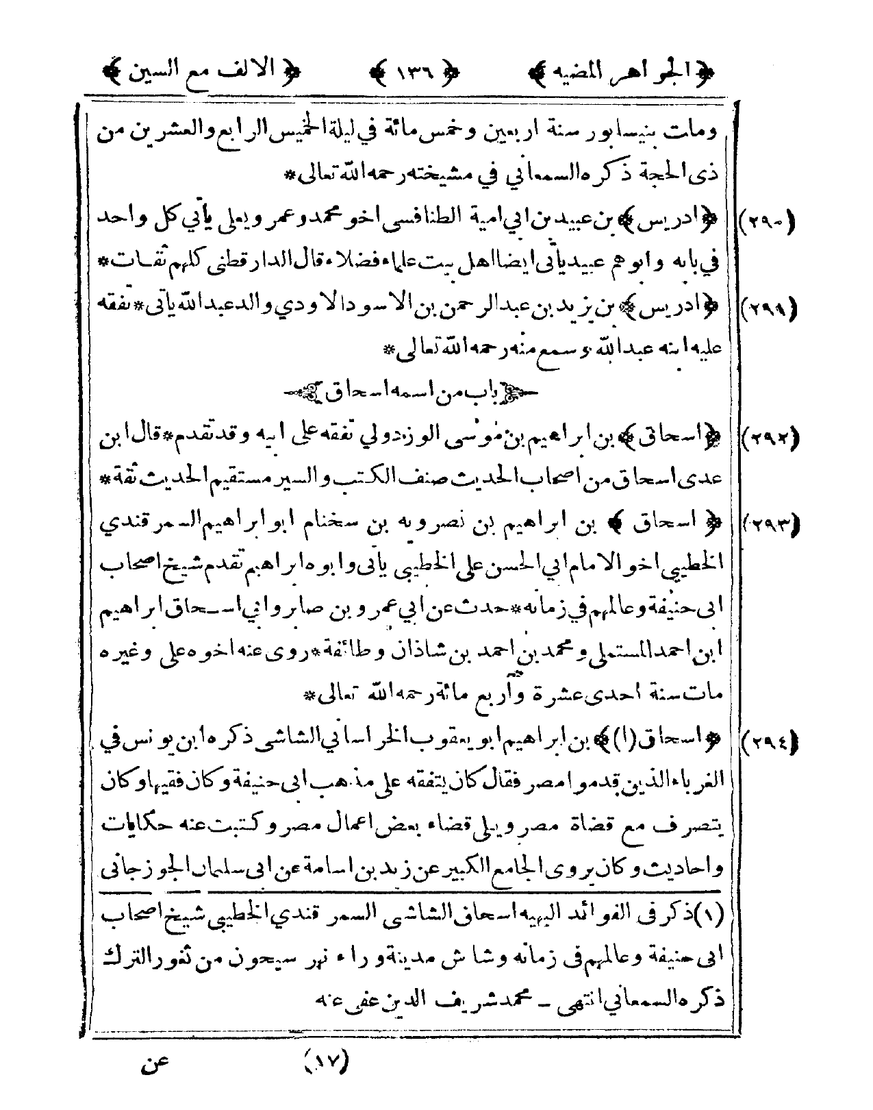 293 - إِسْحَاق بن إِبْرَاهِيم بن نصرويه بن سخنام أَبُو إِبْرَاهِيم السَّمرقَنْدِي الخطيبي أَخُو الإِمَام أبي الْحسن عَليّ الخطيبي يَأْتِي وَأَبوهُ إِبْرَاهِيم تقدم شيخ أَصْحَاب أبي حنيفَة وعالمهم فى زَمَانه حدث عَن أبي عَمْرو بن صابر وَأبي إِسْحَاق إِبْرَاهِيم ابْن أَحْمد الْمُسْتَمْلِي وَمُحَمّد بن أَحْمد بن شَاذان وَطَائِفَة روى عَنهُ أَخُوهُ عَليّ وَغَيره مَاتَ سنة إِحْدَى عشرَة وَأَرْبع مائَة رَحمَه الله تَعَالَى
