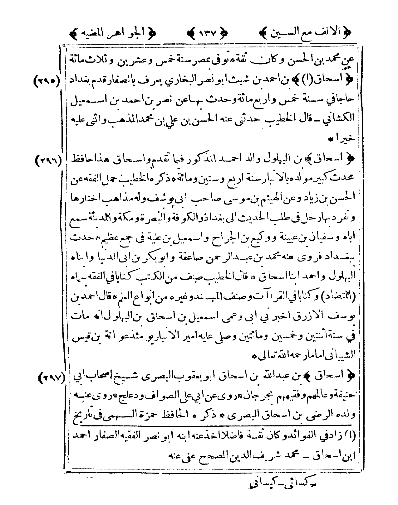 295 - إِسْحَاق بن أَحْمد بن شِيث أَبُو نصر البُخَارِيّ يعرف بالصفار قدم بَغْدَاد حَاجا فى سنة خمس وَأَرْبع مائَة وَحدث بهَا عَن نصر بن أَحْمد بن إِسْمَعِيل الكشاني قَالَ الْخَطِيب حَدثنِي عَنهُ الْحسن بن عَليّ بن مُحَمَّد الْمَذْهَب وَأثْنى عَلَيْهِ خيرا