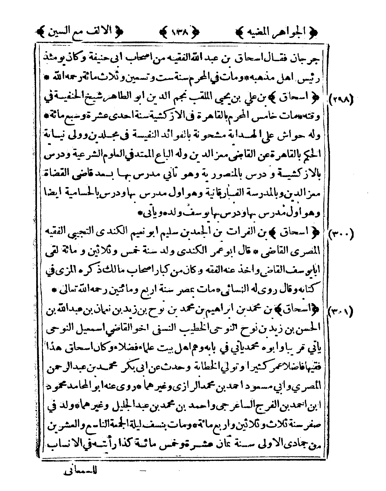 298 - إِسْحَاق بن عَليّ بن يحيى الملقب نجم الدّين أَبُو الطَّاهِر شيخ الْحَنَفِيَّة فى وقته مَاتَ خَامِس الْمحرم بِالْقَاهِرَةِ فى الأزكشية سنة إِحْدَى عشرَة وَسبع مائَة وَله حواش على الْهِدَايَة مشحونة بالفوائد النفيسة فى مجلدين وَولى نِيَابَة الحكم بِالْقَاهِرَةِ عَن القَاضِي معز الدّين وَله الباع الممتد فى الْعُلُوم الشَّرْعِيَّة ودرس بالأزكشية ودرس بالمنصورية وَهُوَ ثَانِي مدرس بهَا بِسَعْد قَاضِي الْقُضَاة مسر الدّين وبالمدرسة الفارقانية وَهُوَ أول مدرس بهَا ودرس بالحسامية أَيْضا وَهُوَ أول مدرس بهَا ودرس بهَا يُوسُف وَلَده وَيَأْتِي