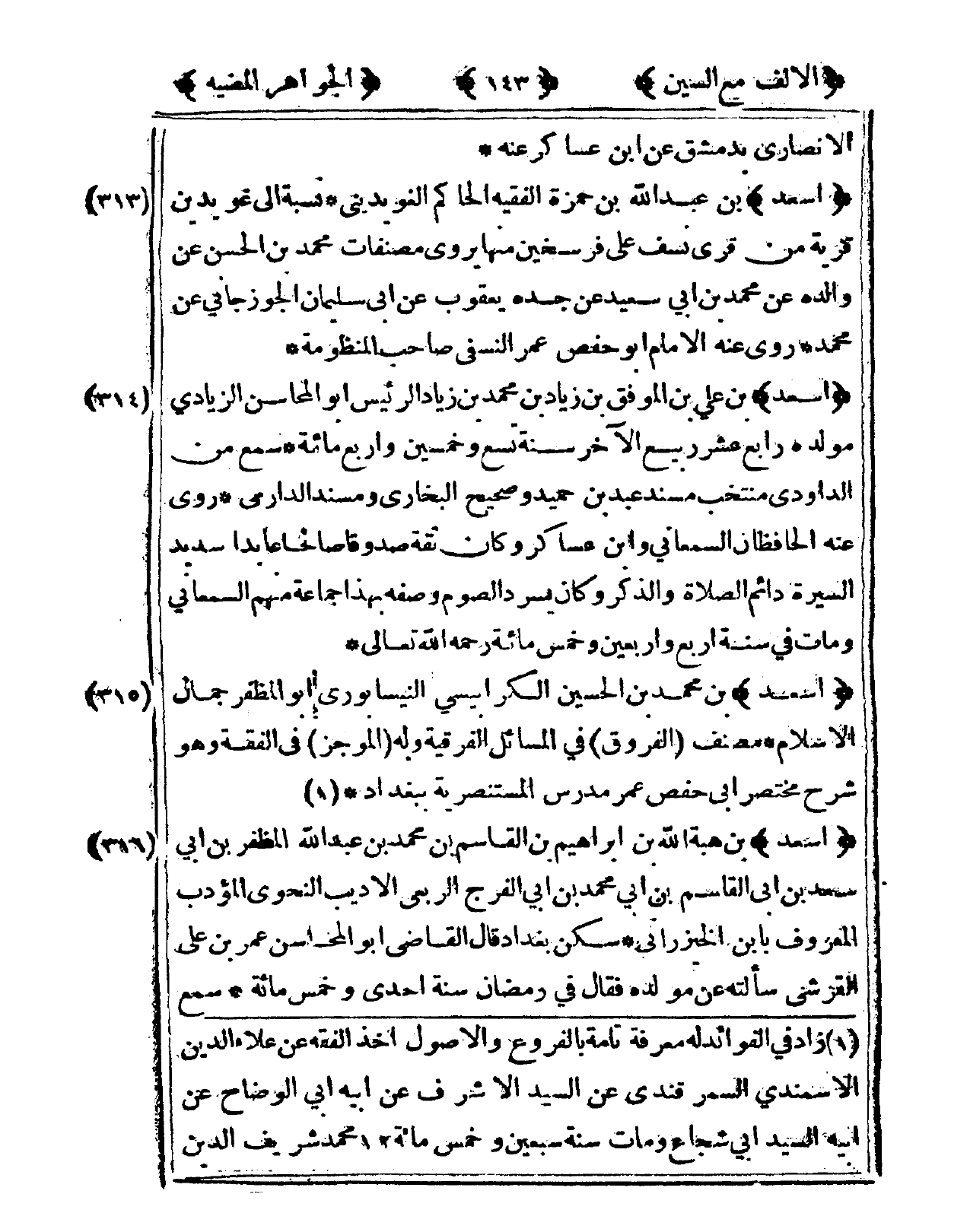 313 - أسعد بن عبد الله بن حَمْزَة الْفَقِيه الْحَاكِم العويديني نِسْبَة إِلَى غويدين قَرْيَة من قرى نسف على فرسخين مِنْهَا يرْوى مصنفات مُحَمَّد بن الْحسن عَن وَالِده عَن مُحَمَّد بن أبي سعيد عَن جده يَعْقُوب عَن أَبى سُلَيْمَان الْجوزجَاني عَن مُحَمَّد روى عَنهُ الإِمَام أَبُو حَفْص عمر النَّسَفِيّ صَاحب الْمَنْظُومَة