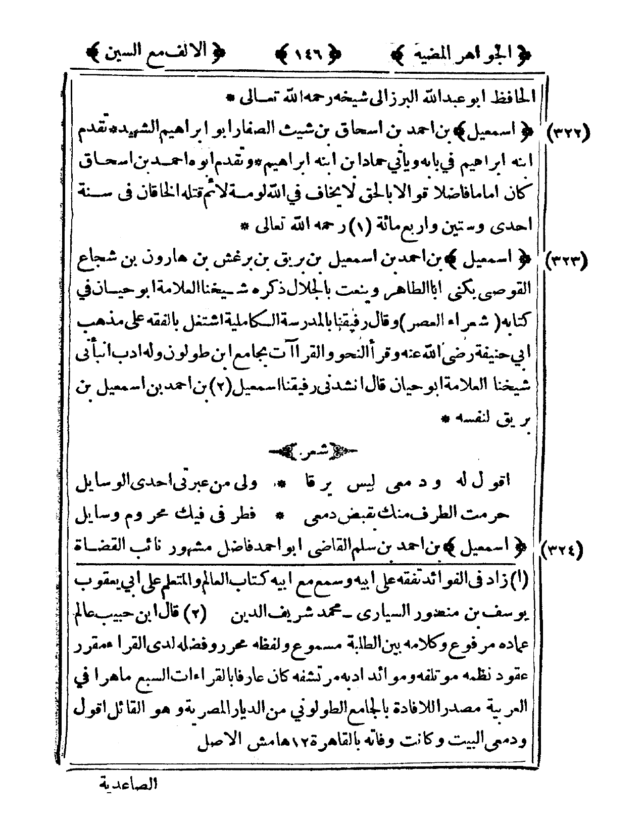 323 - إِسْمَعِيل بن أَحْمد بن إِسْمَعِيل بن بريق ين برغش بن هَارُون بن شُجَاع القوصي يكنى أَبَا الطَّاهِر وينعت بالجلال ذكره شَيخنَا الْعَلامَة أَبُو حَيَّان فى كِتَابه شعراء الْعَصْر وَقَالَ رفيقنا بِالْمَدْرَسَةِ الكاملية اشْتغل بالفقه على مَذْهَب أَبى حنيفَة رَضِي الله عَنهُ وَقَرَأَ النَّحْو والقراآت بِجَامِع ابْن طولون وَله أدب أنبأني شَيخنَا الْعَلامَة أَبُو حَيَّان قَالَ أَنْشدني رفيقنا إِسْمَعِيل بن أَحْمد بن إِسْمَعِيل بن بريق لنَفسِهِ شعر ... أَقُول لَهُ ود معي لَيْسَ يرقا ... ولى من عبرتي إِحْدَى الوسايل
