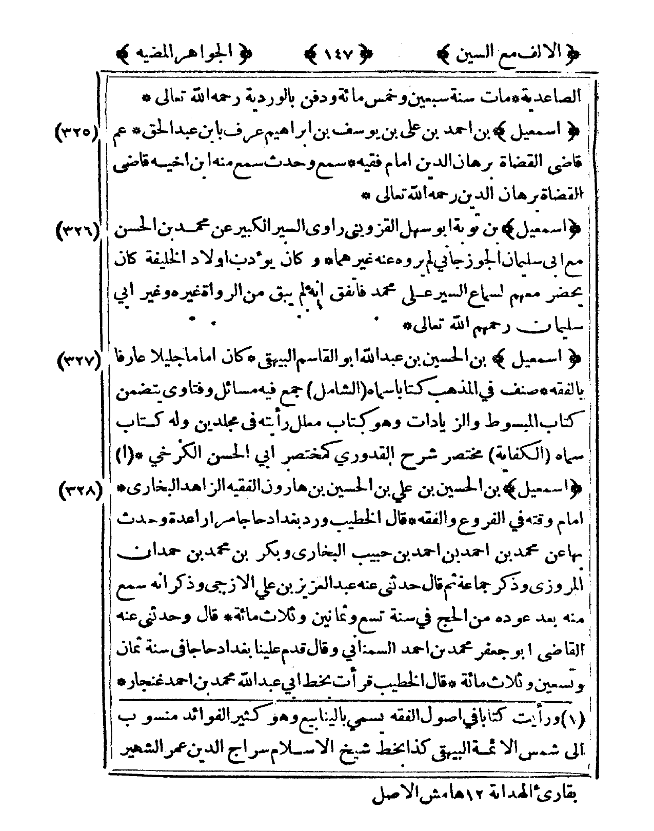 327 - إِسْمَعِيل بن الْحُسَيْن بن عبد الله أَبُو الْقَاسِم الْبَيْهَقِيّ كَانَ إِمَامًا جَلِيلًا عَارِفًا بالفقه صنف فى الْمَذْهَب كتابا سَمَّاهُ الشَّامِل جمع فِيهِ مسَائِل وفتاوي يتَضَمَّن كتاب الْمَبْسُوط والزيادات وَهُوَ كتاب مُعَلل رَأَيْته فى مجلدين وَله كتاب سَمَّاهُ الْكِفَايَة مُخْتَصر شرح الْقَدُورِيّ كمختصر أَبى الْحسن الْكَرْخِي