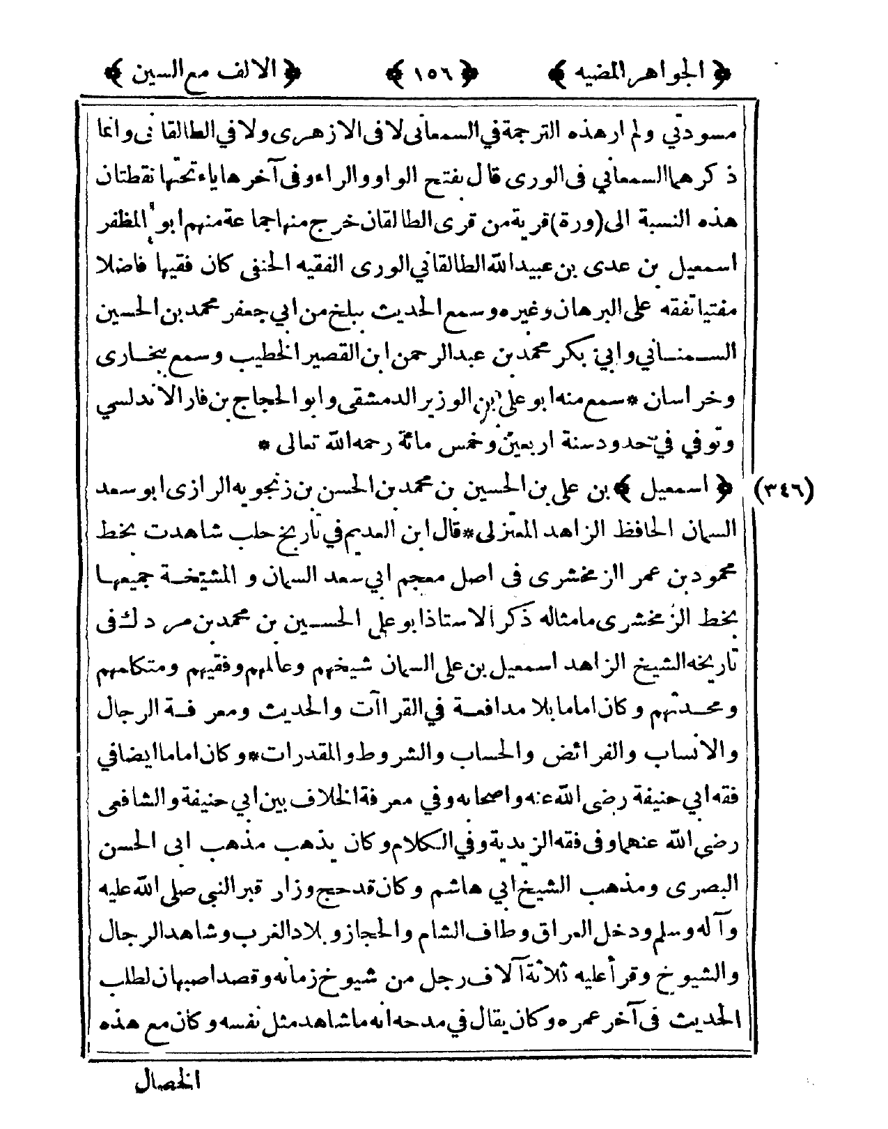 346 - إِسْمَعِيل بن عَليّ بن الْحُسَيْن بن مُحَمَّد بن الْحسن بن زَنْجوَيْه الرَّازِيّ أَبُو سعد السمان الْحَافِظ الزَّاهِد المعتزلي قَالَ ابْن العديم فى تَارِيخ حلب شاهدت بِخَط مَحْمُود بن عمر الزَّمَخْشَرِيّ فى أصل مُعْجم أبي سعد السمان والمشيخة جَمِيعهَا بِخَط الزَّمَخْشَرِيّ مَا مِثَاله ذكر الْأُسْتَاذ أَبُو عَليّ الْحُسَيْن بن مُحَمَّد بن مردك فى تَارِيخه الشَّيْخ الزَّاهِد إِسْمَعِيل بن عَليّ السمان شيخهم وعالمهم وفقيهم ومتكلمهم ومحدثهم وَكَانَ إِمَامًا بِلَا مدافعة فى القراآت والْحَدِيث وَمَعْرِفَة الرِّجَال والأنساب والفرائض والحساب والشروط والمقدرات وَكَانَ إِمَامًا أَيْضا فى فقه أبي حنيفَة رَضِي الله عَنهُ وَأَصْحَابه وفى معرفَة الْخلاف بَين أبي حنيفَة وَالشَّافِعِيّ رَضِي الله عَنْهُمَا وفى فقه الزيدية وفى الْكَلَام وَكَانَ يذهب مَذْهَب أبي الْحسن الْبَصْرِيّ وَمذهب الشَّيْخ أبي هَاشم وَكَانَ قد حج وزار قبر النَّبِي صلى الله عَلَيْهِ وَسلم وَدخل الْعرَاق وَطَاف الشَّام والحجاز وبلاد الغرب وَشَاهد الرِّجَال والشيوخ وَقَرَأَ عَلَيْهِ ثَلَاثَة آلَاف رجل من شُيُوخ زَمَانه وَقصد أَصْبَهَان لطلب الحَدِيث فى آخر عمره وَكَانَ يُقَال فى مدحه أَنه مَا شَاهد مثل نَفسه وَكَانَ مَعَ هَذِه