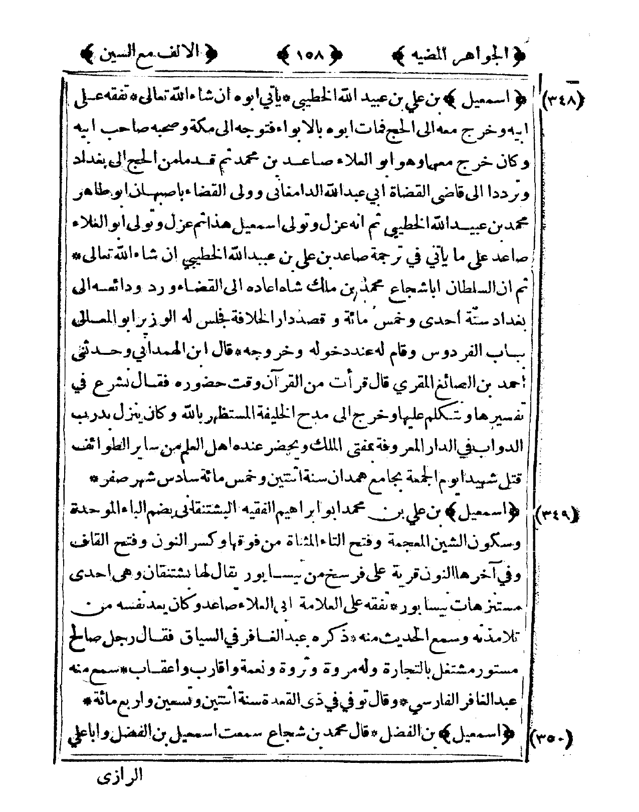 348 - إِسْمَعِيل بن عَليّ بن عبيد الله الخطيبي يَأْتِي أَبوهُ إِن شَاءَ الله تَعَالَى تفقه على أَبِيه وَخرج مَعَه إِلَى الْحَج فَمَاتَ أَبوهُ بالأوباء فَتوجه إِلَى مَكَّة وَصَحبه صَاحب أَبِيه وَكَانَ خرج مَعَهُمَا وَهُوَ أَبُو الْعَلَاء صاعد بن مُحَمَّد ثمَّ قدما من الْحَج إِلَى بَغْدَاد وترددا إِلَى قَاضِي الْقُضَاة أبي عبد الله الدَّامغَانِي وَولى الْقَضَاء بأصبهان أَبُو طَاهِر مُحَمَّد بن عبيد الله الخطيبي ثمَّ أَنه عزل وَتَوَلَّى إِسْمَعِيل هَذَا ثمَّ عزل وَتَوَلَّى أَبُو الْعَلَاء صاعد على مَا يَأْتِي فى تَرْجَمَة صاعد بن عَليّ بن عبيد الله الخطيبي إِن شَاءَ الله تَعَالَى ثمَّ إِن السُّلْطَان أَبَا شُجَاع مُحَمَّد بن ملك شاه أَعَادَهُ إِلَى الْقَضَاء ورد ودائعه إِلَى بَغْدَاد سنة إِحْدَى وَخمْس مائَة وَقصد دَار الْخلَافَة فَجَلَسَ لَهُ الْوَزير أَبُو الْمَعَالِي بِبَاب الفردوس وَقَامَ لَهُ عِنْد دُخُوله وَخُرُوجه قَالَ ابْن الْهَمدَانِي وحَدثني أَحْمد بن الصَّائِغ الْمقري قَالَ قَرَأت من الْقُرْآن وَقت حُضُوره فَقَالَ تشرع فى تَفْسِيرهَا ونتكلم عَلَيْهَا وَخرج إِلَى مدح الْخَلِيفَة المستظهر بِاللَّه وَكَانَ ينزل بدرب الدَّوَابّ فى الدَّار الْمَعْرُوفَة بمفتي الْملك ويحضر عِنْده أهل الْعلم من ساير الطوائف قتل شَهِيدا يَوْم الْجُمُعَة بِجَامِع هَمدَان سنة اثْنَتَيْنِ وَخمْس مائَة سادس شهر صفر