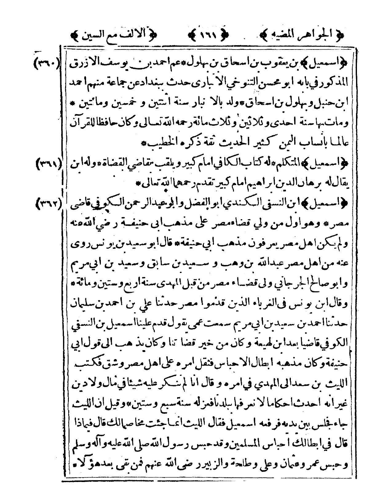 361 - إِسْمَعِيل الْمُتَكَلّم لَهُ كتاب الْكَافِي إِمَام كَبِير ويلقب بقاضي الْقُضَاة وَله ابْن يُقَال لَهُ برهَان الدّين إِبْرَاهِيم إِمَام كَبِير تقدم رحمهمَا الله تَعَالَى