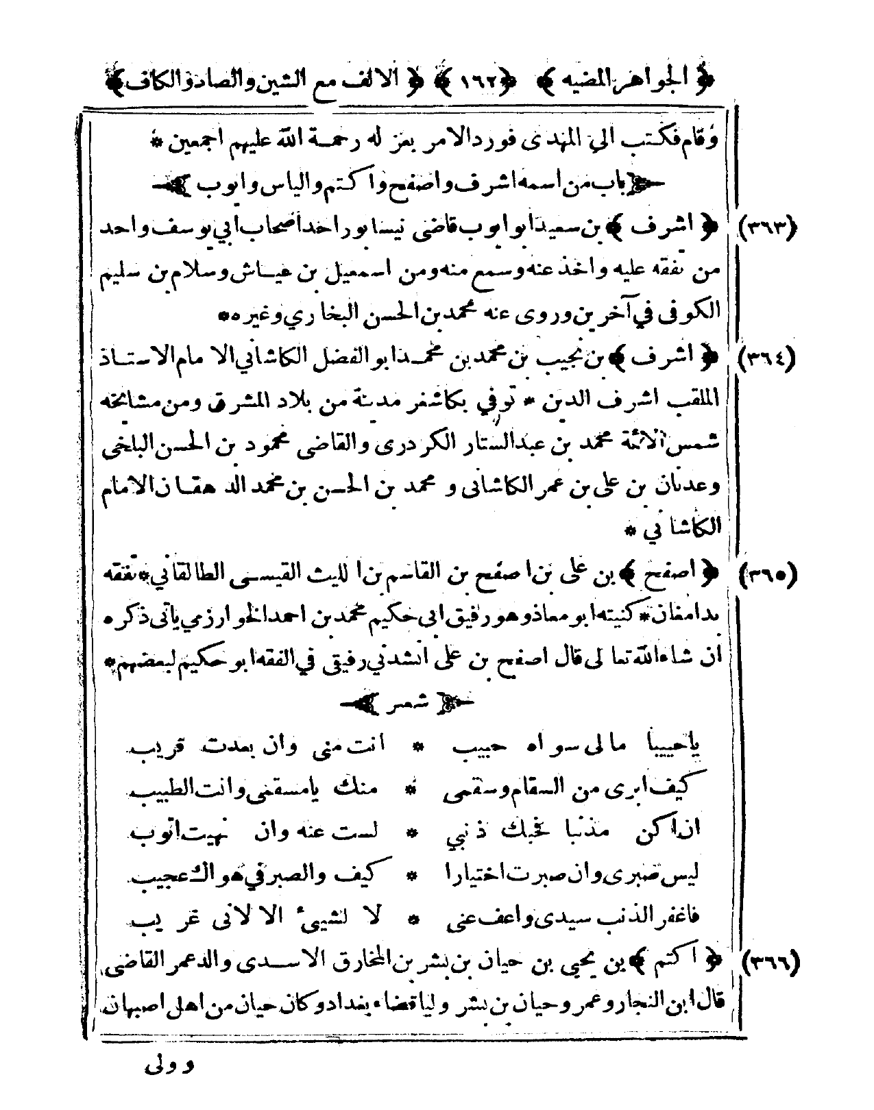 364 - أشرف بن نجيب بن مُحَمَّد بن مُحَمَّد أَبُو الْفضل الكاشاني الإِمَام الْأُسْتَاذ الملقب أشرف الدّين توفّي بكاشغر مَدِينَة من بِلَاد الْمشرق وَمن مشايخه شمس الْأَئِمَّة مُحَمَّد بن عبد الستار الكردري وَالْقَاضِي مَحْمُود بن الْحسن الْبَلْخِي وعدنان بن عَليّ بن عمر الكاشاني وَمُحَمّد بن الْحسن بن مُحَمَّد الدهْقَان الإِمَام الكاشاني