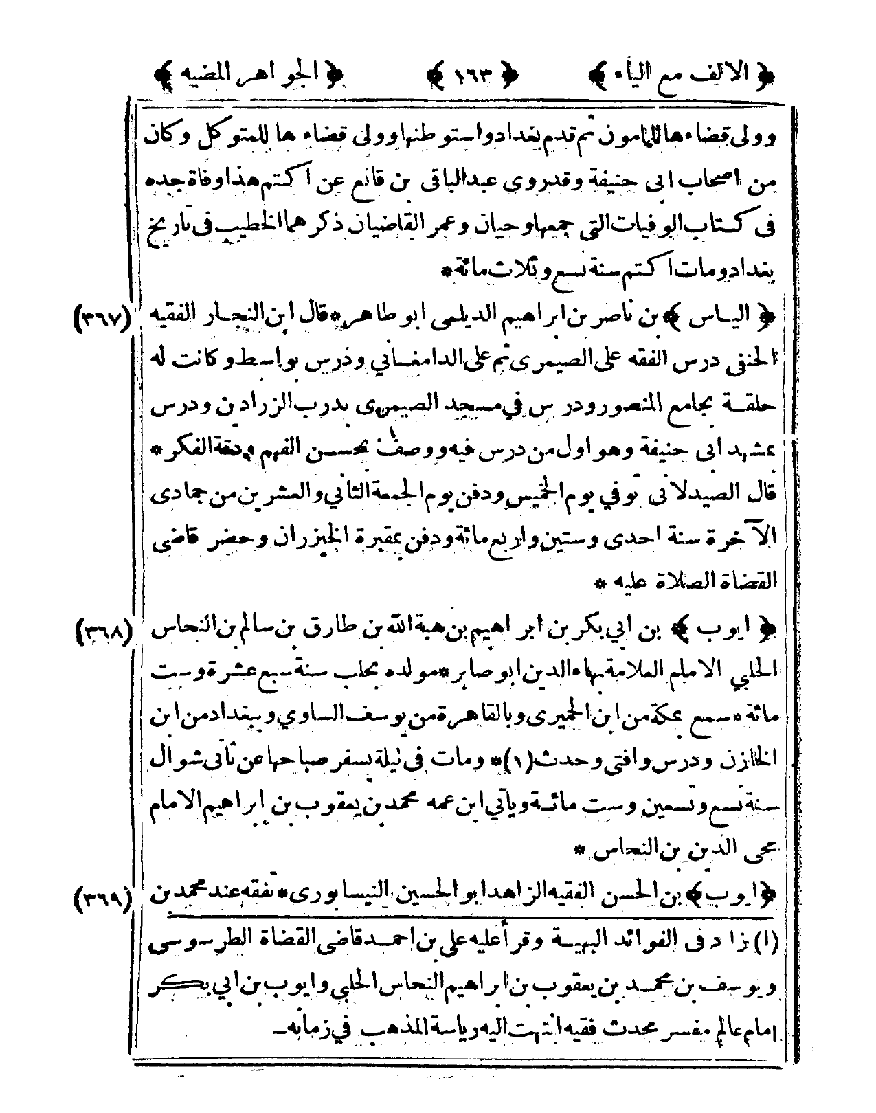 367 - إلْيَاس بن نَاصِر بن إِبْرَاهِيم الديلمي أَبُو طَاهِر قَالَ ابْن النجار الْفَقِيه الْحَنَفِيّ درس الْفِقْه على الصَّيْمَرِيّ ثمَّ على الدَّامغَانِي ودرس بواسط وَكَانَت لَهُ حَلقَة بِجَامِع الْمَنْصُور ودرس فى مَسْجِد الصَّيْمَرِيّ بدرب الزرادين ودرس بمشهد أبي حنفية وَهُوَ أول من درس فِيهِ وَوصف بِحسن الْفَهم ودقة الْفِكر قَالَ الصيدلاني توفّي يَوْم الْخَمِيس وَدفن يَوْم الْجُمُعَة الثَّانِي وَالْعِشْرين من جمادي الْآخِرَة سنة إِحْدَى وَسِتِّينَ وَأَرْبع مائَة وَدفن بمقبرة الخيزران وَحضر قَاضِي الْقُضَاة الصَّلَاة عَلَيْهِ