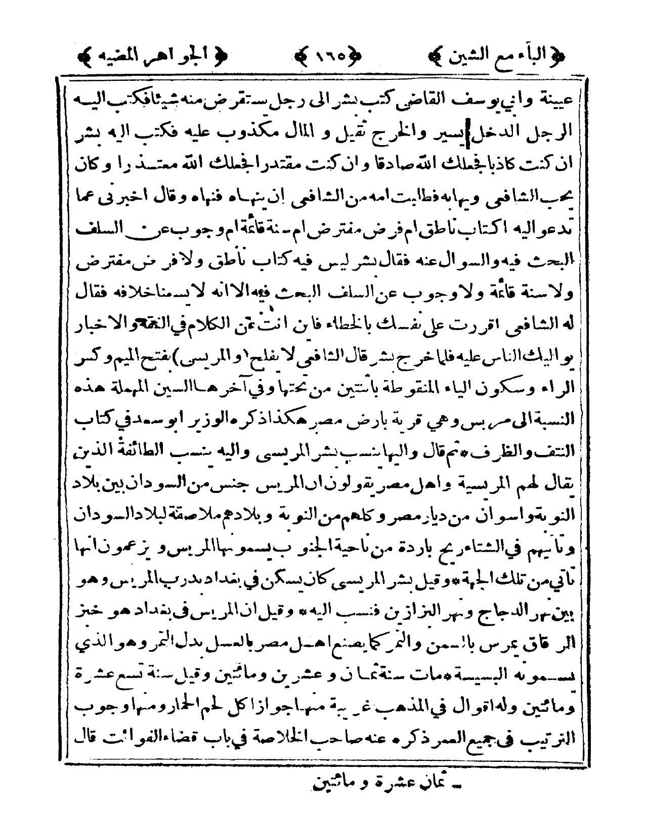 عُيَيْنَة وأبى يُوسُف القَاضِي كتب بشر إِلَى رجل يستقرض مِنْهُ شَيْئا فَكتب إِلَيْهِ الرجل الدخل يسير والرج ثقيل وَالْمَال مَكْذُوب عَلَيْهِ فَكتب إِلَيْهِ بشر إِن كنت كَاذِبًا فجعلك الله صَادِقا وَإِن كنت مقتدرا فجعلك الله معتذرا وَكَانَ يحب الشَّافِعِي ويهابه فطلبت أمه من الشَّافِعِي أَن ينهاه فَنَهَاهُ وَقَالَ أَخْبرنِي عَمَّا تَدْعُو إِلَيْهِ أكتاب نَاطِق أم مفترض معترض أم سنة قَائِمَة أم وجوب عَن السّلف الْبَحْث فِيهِ وَالسُّؤَال عَنهُ فَقَالَ بشر لَيْسَ فِيهِ كتاب نَاطِق وَلَا فرض مفترض وَلَا سنة قَائِمَة وَلَا وجوب عَن السّلف الْبَحْث فِيهِ إِلَّا أَنه لَا يسعنا خِلَافه فَقَالَ لَهُ الشَّافِعِي أَقرَرت على نَفسك بالخطاء فَأَيْنَ أَنْت عَن الْكَلَام فى الْفِقْه وَالْأَخْبَار يواليك النَّاس عَلَيْهِ فَلَمَّا خرج بشر قَالَ الشَّافِعِي لَا يفلح والمريسي بِفَتْح الْمِيم وَكسر الرَّاء وَسُكُون الْيَاء المنقوطة بِاثْنَيْنِ من تحتهَا وفى آخرهَا السِّين الْمُهْملَة هَذِه النِّسْبَة إِلَى مربس وهى قَرْيَة بِأَرْض مصر هَكَذَا ذكره الْوَزير أَبُو سعد فى كتاب النتف والظرف ثمَّ قَالَ وإليها ينْسب بشر المريسي وَإِلَيْهِ ينْسب الطَّائِفَة الَّذين يُقَال لَهُم المريسية وَأهل مصر يَقُولُونَ أَن المريس جنس من السودَان بَين بِلَاد النّوبَة وأسوان من ديار مصر وَكلهمْ من النّوبَة وبلادهم ملاصقة لبلاد السودَان وتأتيهم فى الشتَاء ريح بَارِدَة من نَاحيَة الْجنُوب يسمونها المريس ويزعمون أَنَّهَا تَأتي من تِلْكَ الْجِهَة وَقيل بشر المريسي كَانَ يسكن فى بَغْدَاد بدرب المريس وَهُوَ بَين نهر الدَّجَاج ونهر البزازين فنسب إِلَيْهِ وَقيل إِن المريس فى بَغْدَاد هُوَ خبز الرقَاق يمرس بالسمن وَالتَّمْر كَمَا يصنع أهل مصر بالعسل بدل التَّمْر وَهَذَا الَّذِي يسمونه البسيسة مَاتَ سنة ثَمَان وَعشْرين وَمِائَتَيْنِ وَقيل سنة تسع عشرَة وَمِائَتَيْنِ وَله أَقْوَال فى الْمَذْهَب غَرِيبَة مِنْهَا جَوَاز أكل لحم الْحمار وَمِنْهَا وجوب التَّرْتِيب فى جَمِيع الْعُمر ذكره عَنهُ صَاحب الْخُلَاصَة فى بَاب قَضَاء الْفَوَائِت قَالَ