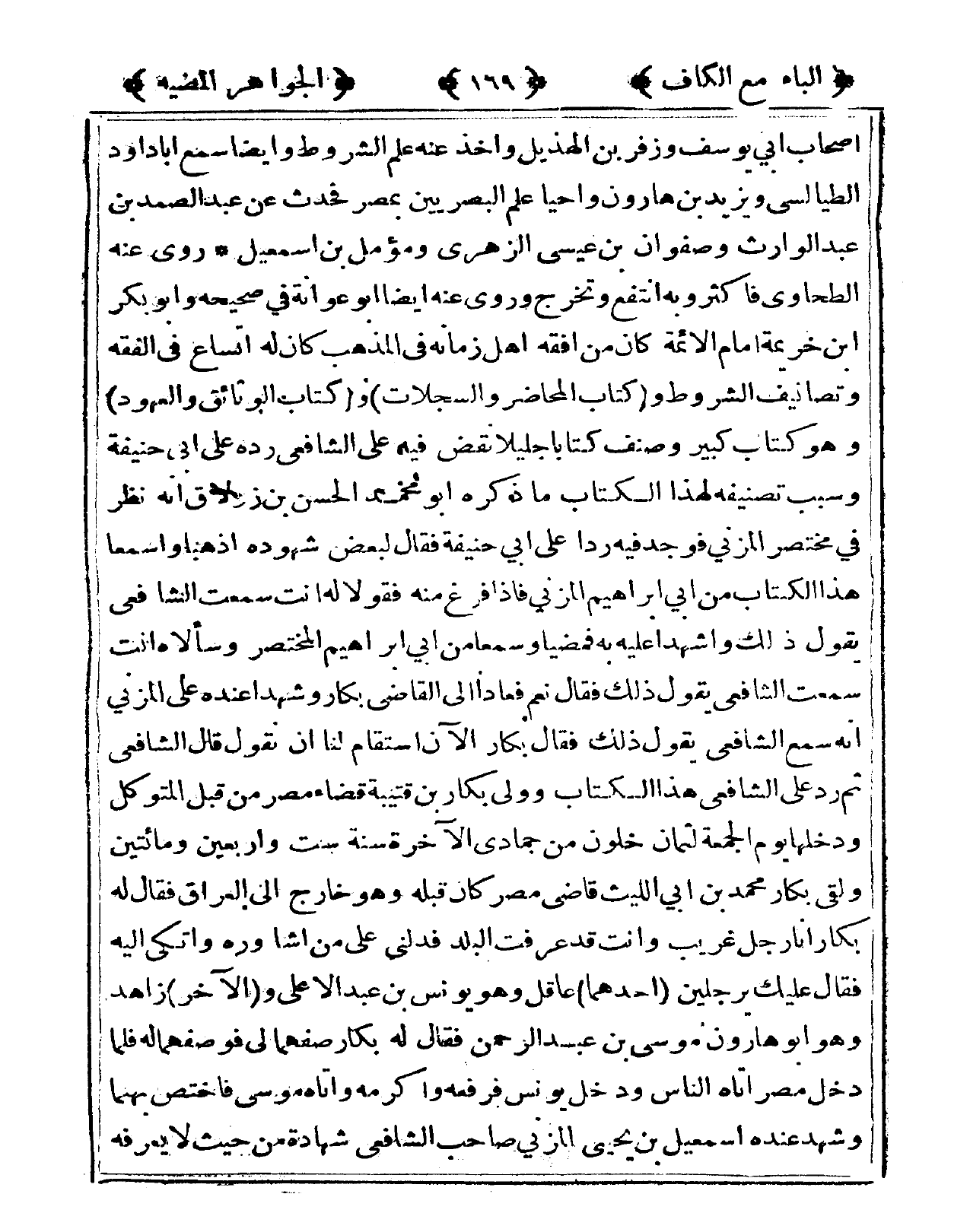 أَصْحَاب أبي يُوسُف وَزفر بن الْهُذيْل وَأخذ عَنهُ علم الشُّرُوط وَأَيْضًا سمع أَبَا دَاوُد الطَّيَالِسِيّ وَيزِيد بن هَارُون وَأَحْيَا علم الْبَصرِيين بِمصْر فَحدث عَن عبد الصَّمد بن عبد الْوَارِث وَصَفوَان بن عِيسَى الزُّهْرِيّ ومؤمل بن إِسْمَعِيل روى عَنهُ الطَّحَاوِيّ فَأكْثر وَبِه انْتفع وَتخرج وروى عَنهُ أَيْضا ابو عوَانَة فى صَحِيحه وَأَبُو بكر ابْن خُزَيْمَة أَمَام الْأَئِمَّة كَانَ من أفقه أهل زَمَانه فى الْمَذْهَب كَانَ لَهُ اتساع فى الْفِقْه وتصانيف الشُّرُوط وَكتاب المحاضر والسجلات وَكتاب الوثائق والعهود وَهُوَ كتاب كَبِير وصنف كتابا جَلِيلًا نقض فِيهِ على الشَّافِعِي رده على أبي حنيفَة وَسبب تصنيفه لهَذَا الْكتاب مَا ذكره أَبُو مُحَمَّد الْحسن بن زولاق أَنه نظر فى مُخْتَصر الْمُزنِيّ فَوجدَ فِيهِ ردا على أبي حنيفَة فَقَالَ لبَعض شُهُوده اذْهَبَا واسمعا هَذَا الْكتاب من أبي إِبْرَاهِيم الْمُزنِيّ فَإِذا فرغ مِنْهُ فقولا لَهُ أَنْت سَمِعت الشَّافِعِي يَقُول ذَلِك وأشهدا عَلَيْهِ بِهِ فمضيا وسمعا من أبي إِبْرَاهِيم الْمُخْتَصر وسألاه أَنْت سَمِعت الشَّافِعِي يَقُول ذَلِك فَقَالَ نعم فَعَاد إِلَى القَاضِي بكار وشهدا عِنْده على الْمُزنِيّ أَنه سمع الشَّافِعِي يَقُول ذَلِك فَقَالَ بكار الْآن استقام لنا أَن نقُول قَالَ الشَّافِعِي ثمَّ رد على الشَّافِعِي هَذَا الْكتاب وَولى بكار بن قُتَيْبَة قَضَاء مصر من قبل المتَوَكل ودخلها يَوْم الْجُمُعَة لثمان خلون من جمادي الآخر سنة سِتّ وَأَرْبَعين وَمِائَتَيْنِ وَلَقي بكار مُحَمَّد بن أبي اللَّيْث قَاضِي مصر كَانَ قبله وَهُوَ خَارج إِلَى الْعرَاق فَقَالَ لَهُ بكار أَنا رجل غَرِيب وَأَنت قد عرفت الْبَلَد فدلني على من أشاوره وأتكي إِلَيْهِ فَقَالَ عَلَيْك برجلَيْن أَحدهمَا عَاقل وَهُوَ يُونُس بن عبد الْأَعْلَى وَالْآخر زاهد وَهُوَ ابْن هَارُون مُوسَى بن عبد الرَّحْمَن فَقَالَ لَهُ بكار صفهما لي فوصفهما لَهُ فَلَمَّا دخل مصر أَتَاهُ النَّاس وَدخل يُونُس فرفعه وأكرمه وَأَتَاهُ مُوسَى فاختص بهما وَشهد عِنْده إِسْمَعِيل بن يحيى الْمُزنِيّ صَاحب الشَّافِعِي شَهَادَة من حَيْثُ لَا يعرفهُ