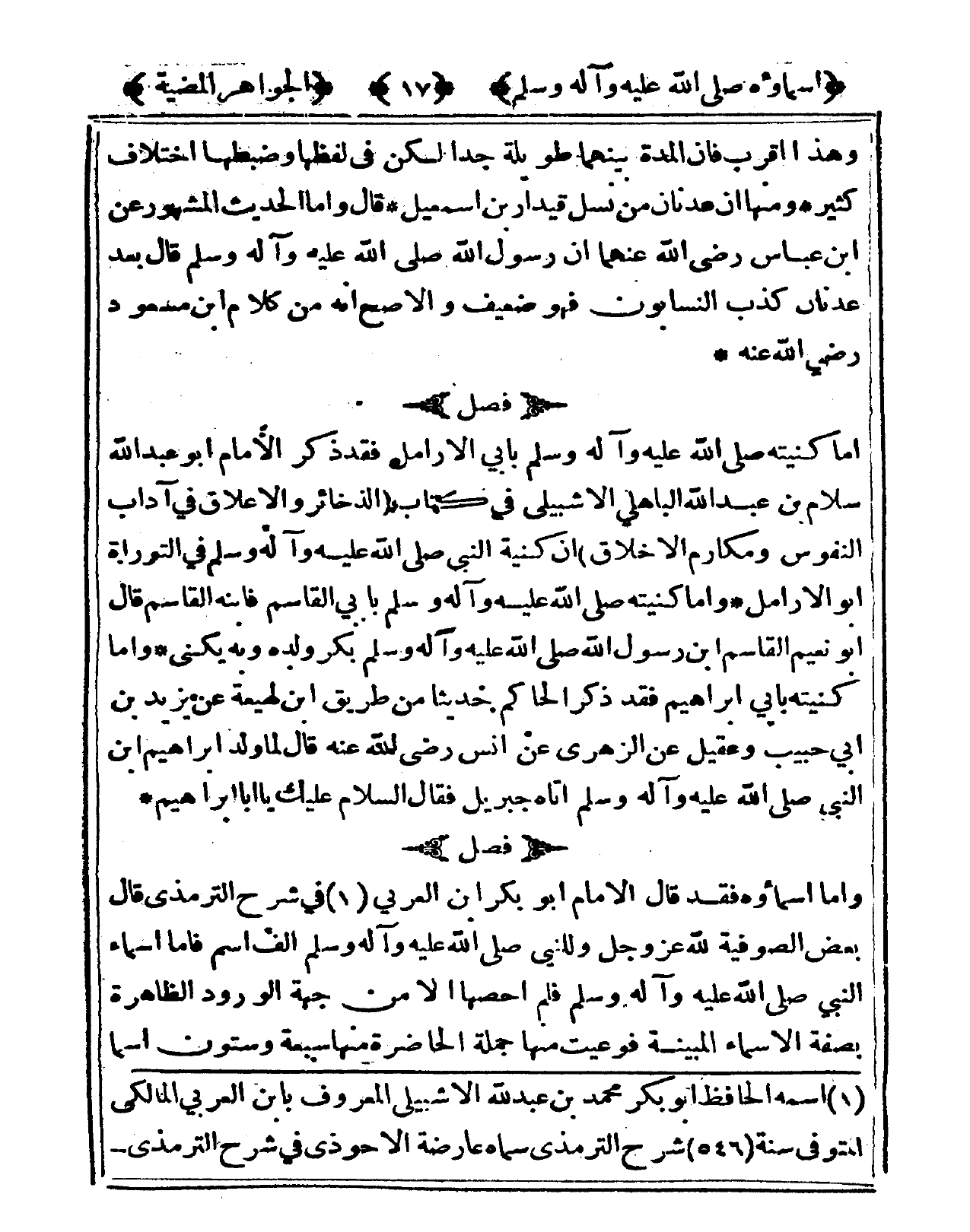 وَأما اسماؤه فقد قَالَ الإِمَام أَبُو بكر ابْن الْعَرَبِيّ فِي شرح التِّرْمِذِيّ قَالَ بعض الصُّوفِيَّة لله عز وَجل وَلِلنَّبِيِّ صلى الله عَلَيْهِ وَسلم ألف اسْم فَأَما أَسمَاء النَّبِي صلى الله عَلَيْهِ وَسلم فَلم أحصها إِلَّا من جِهَة الْوُرُود الظَّاهِرَة بِصفة الْأَسْمَاء المبينة فوعيت مِنْهَا جملَة الْحَاضِرَة مِنْهَا سَبْعَة وَسِتُّونَ اسْما