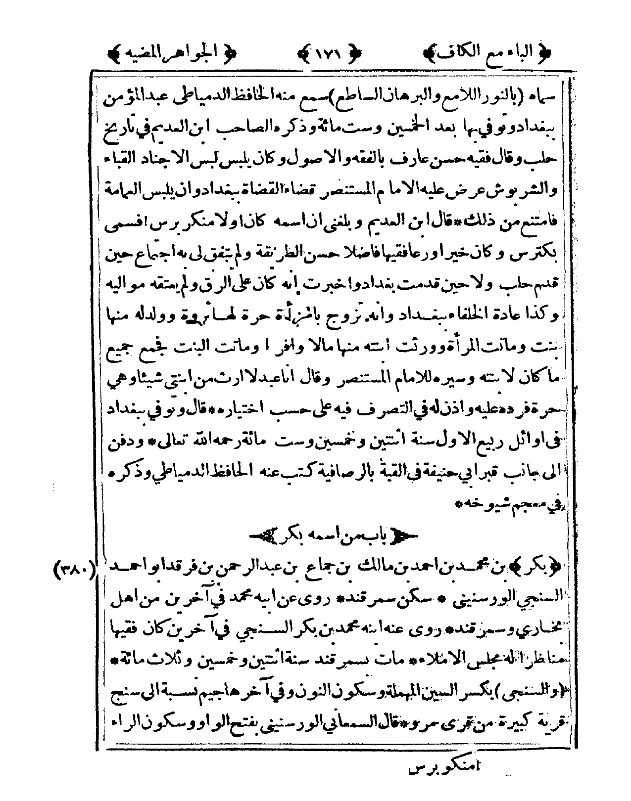 380 - بكر بن مُحَمَّد بن أَحْمد بن مَالك بن جماع بن عبد الرَّحْمَن بن فرقد أَبُو أَحْمد السنجي الورسنيني سكن سَمَرْقَنْد روى عَن أَبِيه مُحَمَّد فى آخَرين من أهل بُخَارى وسمرقند روى عَنهُ ابْنه مُحَمَّد بن بكر السنجي فى آخَرين كَانَ فَقِيها مناظرا لَهُ مجْلِس الْإِمْلَاء مَاتَ بسمرقند سنة اثْنَتَيْنِ وَخمسين وَثَلَاث مائَة والسنجي بِكَسْر السِّين الْمُهْملَة وَسُكُون النُّون وفى آخرهَا جِيم نِسْبَة إِلَى سنج قَرْيَة كبيره من قرى مرو قَالَ السَّمْعَانِيّ الورسنيني بِفَتْح الْوَاو وَسُكُون الرَّاء