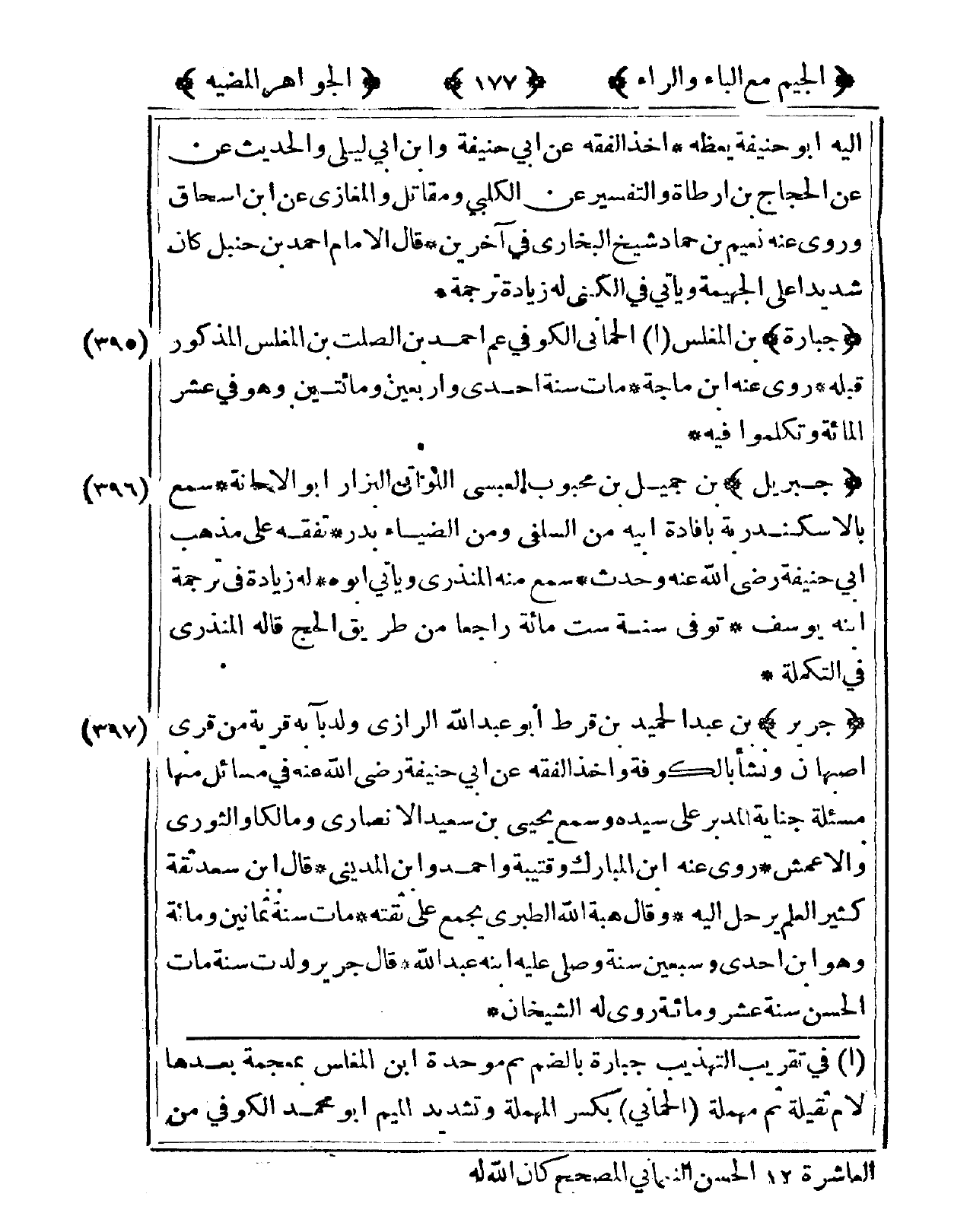395 - جبارَة بن الْمُغلس الْحمانِي الْكُوفِي عَم أَحْمد بن الصَّلْت بن الْمُغلس الْمَذْكُور قبله روى عَنهُ ابْن مَاجَه مَاتَ سنة إِحْدَى وَأَرْبَعين وَمِائَتَيْنِ وَهُوَ فى عشر الْمِائَة وَتَكَلَّمُوا فِيهِ