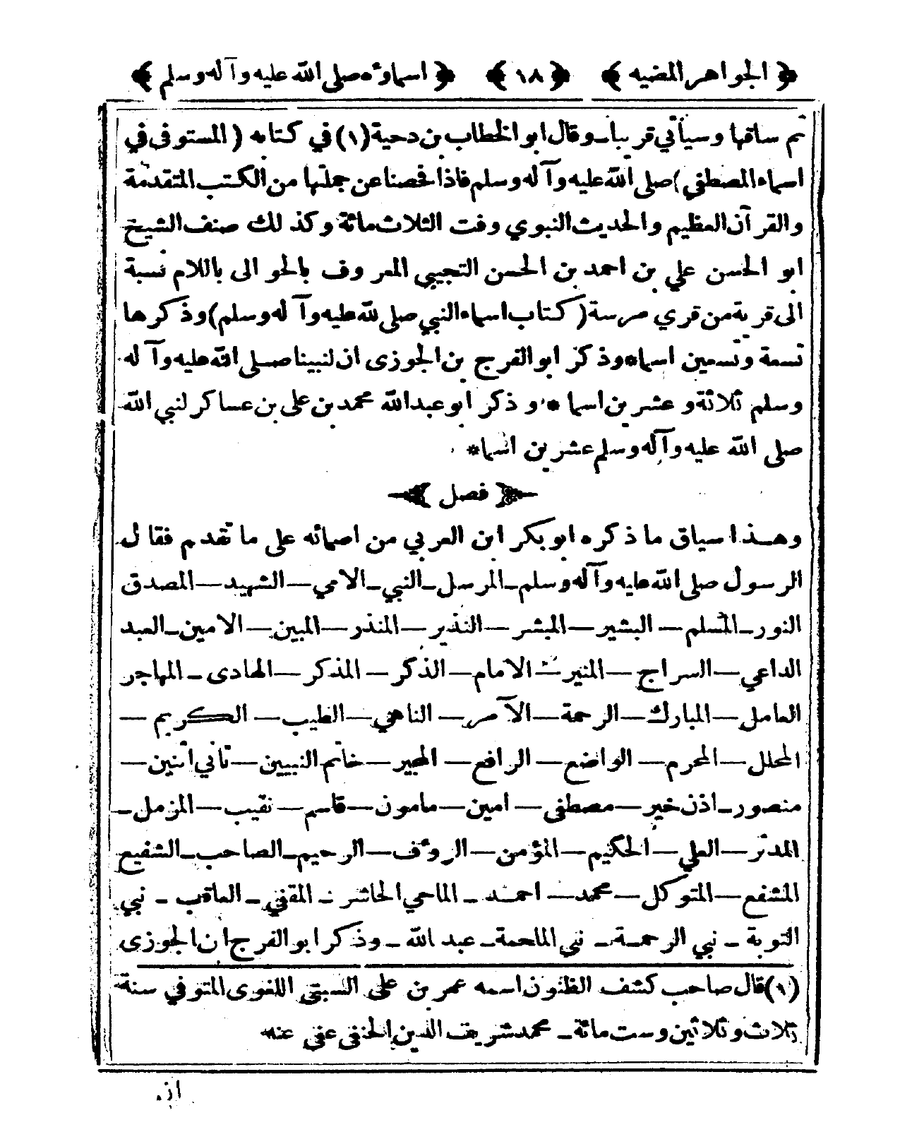 ثمَّ سَاقهَا وَسَيَأْتِي قَرِيبا وَقَالَ أَبُو الْخطاب بن دحْيَة فى كِتَابه الْمُسْتَوْفى فى أَسمَاء الْمُصْطَفى صلى الله عَلَيْهِ وَسلم فَإِذا فحصنا عَن جُمْلَتهَا من الْكتب الْمُتَقَدّمَة وَالْقُرْآن الْعَظِيم والْحَدِيث النَّبَوِيّ وَقت الثَّلَاث مائَة وَكَذَلِكَ صنف الشَّيْخ أَبُو الْحسن عَليّ بن أَحْمد بن الْحسن التجِيبِي الْمَعْرُوف بالحوالي بِاللَّامِ نِسْبَة إِلَى قَرْيَة من قري مرسة كتاب أَسمَاء النَّبِي صلى الله عَلَيْهِ وَسلم وَذكرهَا تِسْعَة وَتِسْعين اسْما وَذكر أَبُو الْفرج بن الْجَوْزِيّ أَن لنبينا صلى الله عَلَيْهِ وَسلم ثَلَاثَة وَعشْرين اسْما وَذكر أَبُو عبد الله مُحَمَّد بن عَليّ بن عَسَاكِر لنَبِيّ الله صلى الله عَلَيْهِ وَسلم عشْرين اسْما