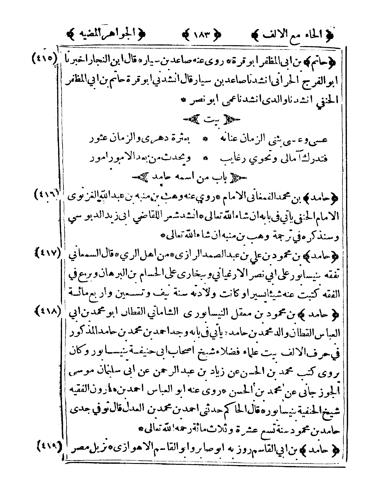 416 - حَامِد بن مُحَمَّد الفمغاني الإِمَام روى عَنهُ وهب بن مُنَبّه بن عبد الله الغزنوي الإِمَام الْحَنَفِيّ يَأْتِي فى بَابه إِن شَاءَ الله تَعَالَى أنْشد شعرًا للْقَاضِي أبي زيد الدبوسي وسنذكره فى تَرْجَمَة وهب بن مُنَبّه إِن شَاءَ الله تَعَالَى