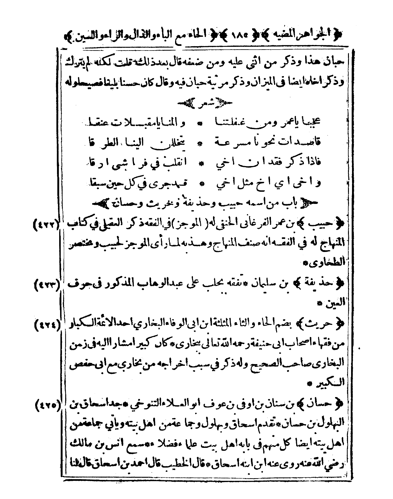 424 - حُرَيْث بِضَم الْحَاء والثاء الْمُثَلَّثَة ابْن أبي الْوَفَاء البُخَارِيّ أحد الْأَئِمَّة الْكِبَار من فُقَهَاء أَصْحَاب أبي حنيفَة رَحمَه الله تَعَالَى ببخارى كَانَ كَبِيرا مشار إِلَيْهِ فى زمن البُخَارِيّ صَاحب الصَّحِيح وَله ذكر فى سَبَب إِخْرَاجه من بُخَارى مَعَ أبي حَفْص الْكَبِير