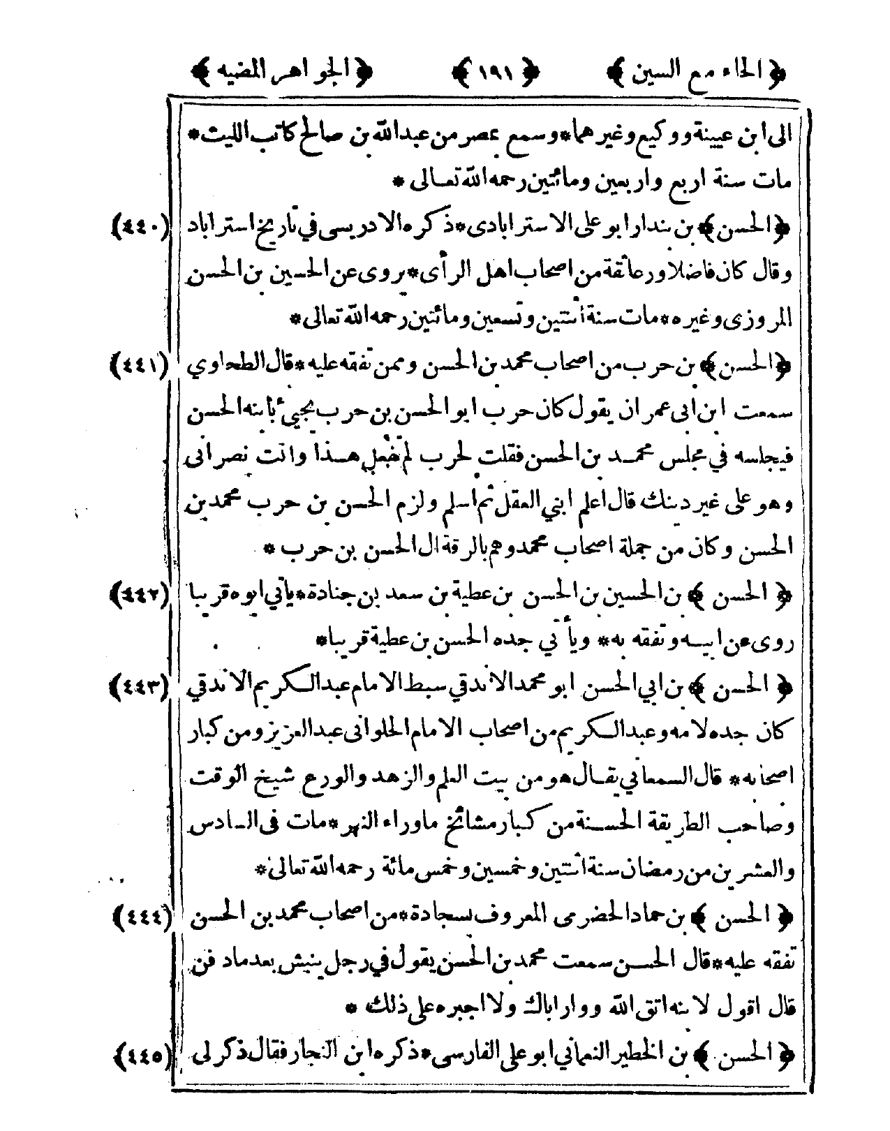 440 - الْحسن بن بنْدَار أَبُو عَليّ الإسترأبادي ذكره الإدريسي فى تَارِيخ إستراباد وَقَالَ كَانَ فَاضلا ورعا ثِقَة من أَصْحَاب أهل الرَّأْي يروي عَن الْحُسَيْن بن الْحسن الْمروزِي وَغَيره مَاتَ سنة اثْنَتَيْنِ وَتِسْعين وَمِائَتَيْنِ رَحمَه الله تَعَالَى