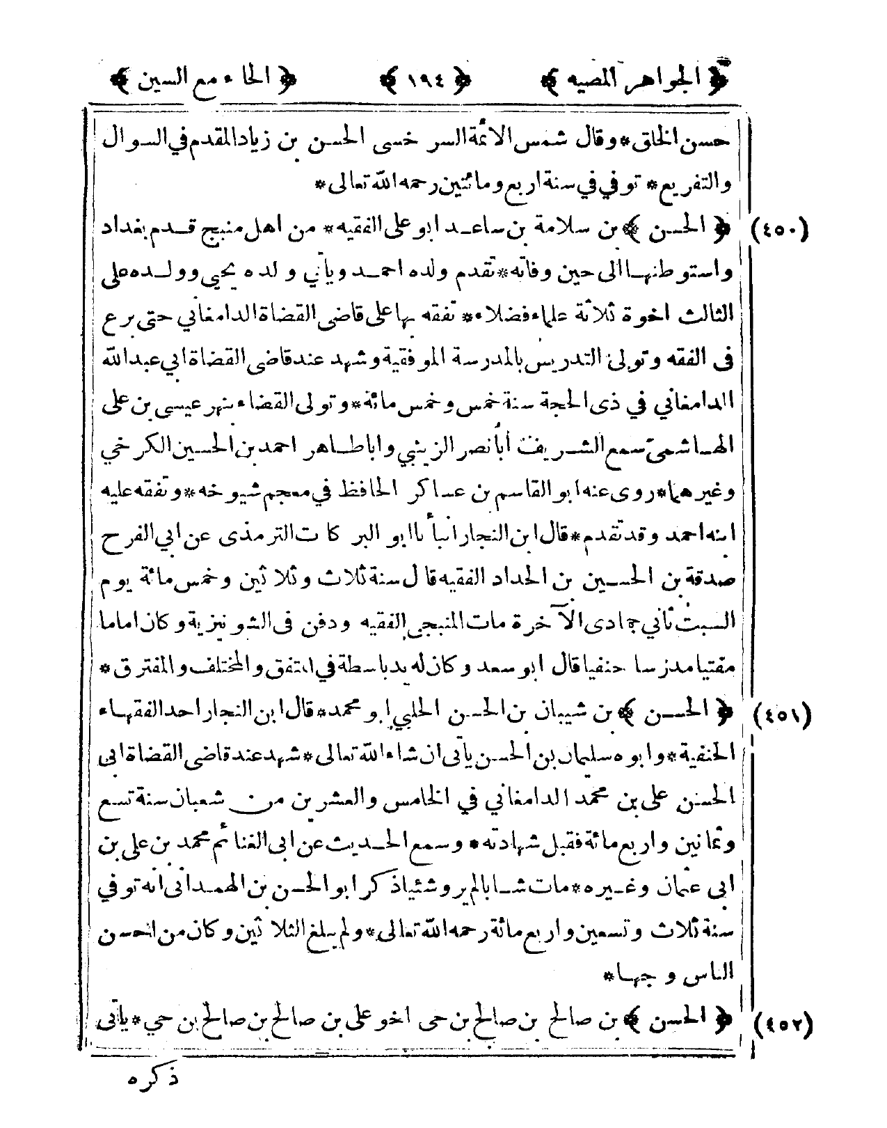 450 - الْحسن بن سَلامَة بن ساعد أَبُو عَليّ الْفَقِيه من أهل منبج قدم بَغْدَاد واستوطنها إِلَى حِين وَفَاته تقدم وَلَده أَحْمد وَيَأْتِي وَلَده يحيى وَولده عَليّ الثَّالِث أخوة ثَلَاثَة عُلَمَاء فضلاء تفقه بهَا على قَاضِي الْقُضَاة الدَّامغَانِي حَتَّى برع فى الْفِقْه وَتَوَلَّى التدريس بِالْمَدْرَسَةِ الموفقية وَشهد عِنْد قَاضِي الْقُضَاة أبي عبد الله الدَّامغَانِي فى ذِي الْحجَّة سنة خمس وَخمْس مائَة وَتَوَلَّى الْقَضَاء بنهر عِيسَى بن عَليّ الْهَاشِمِي سمع الشريف أَبَا نصر الزَّيْنَبِي وَأَبا طَاهِر أَحْمد بن الْحُسَيْن الْكَرْخِي وَغَيرهمَا روى عَنهُ أَبُو الْقَاسِم بن عَسَاكِر الْحَافِظ فى مُعْجم شُيُوخه وتفقه عَلَيْهِ ابْنه أَحْمد وَقد تقدم قَالَ ابْن النجار أَنبأَنَا أَبُو البركات الترميذي عَن أبي الْفَرح صَدَقَة بن الْحُسَيْن بن الْحداد الْفَقِيه قَالَ سنة ثَلَاث وَثَلَاثِينَ وَخمْس مائَة يَوْم السبت ثَانِي جمادي الْآخِرَة مَاتَ المنبجي الْفَقِيه وَدفن فى الشونيزية وَكَانَ إِمَامًا مفتيا مدرسا حنفيا قَالَ أَبُو سعد وَكَانَ لَهُ يَد باسطة فى الْمُتَّفق والمختلف والمفترق