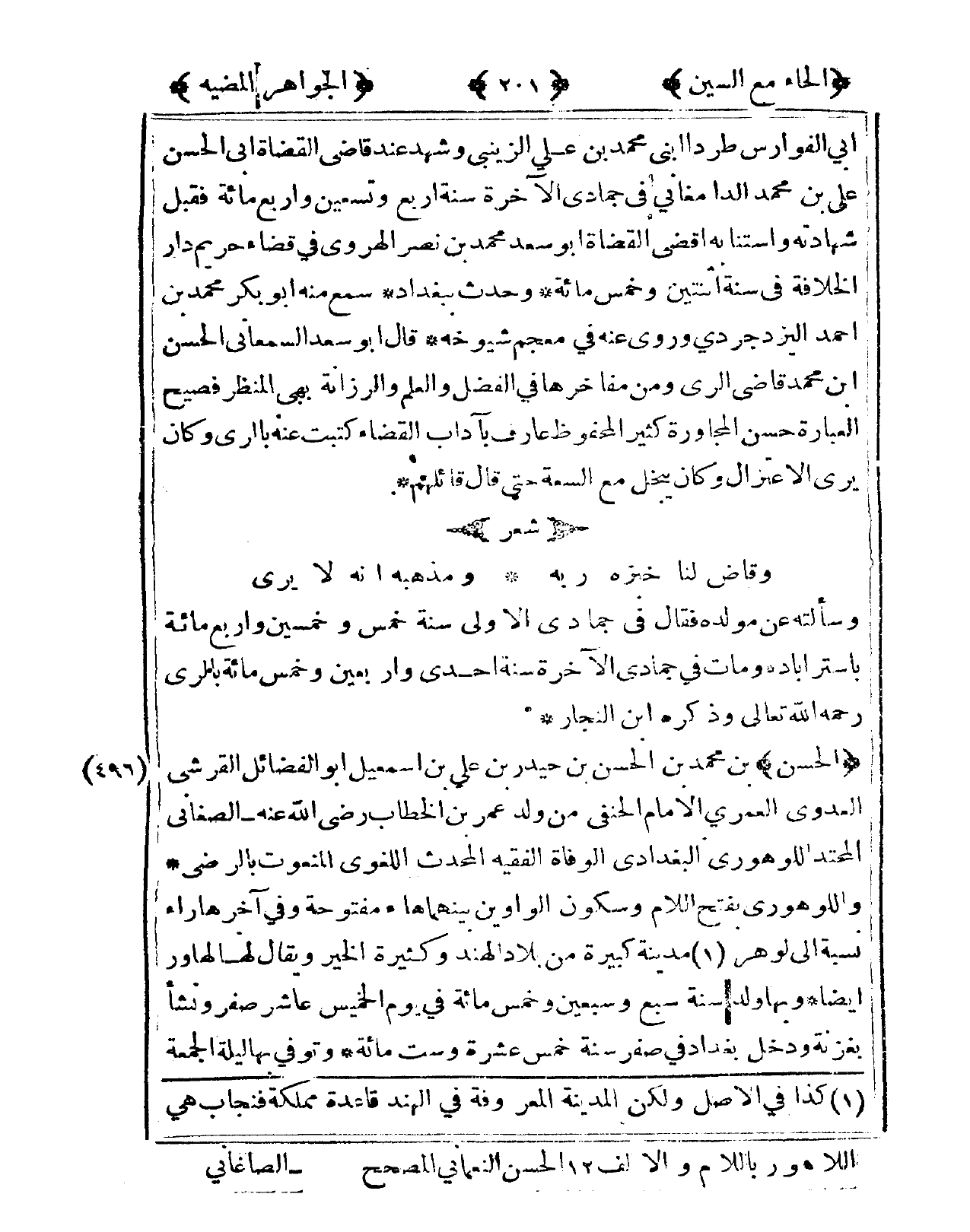 496 - الْحسن بن مُحَمَّد بن الْحسن بن حيدر بن عَليّ بن إِسْمَعِيل أَبُو الْفَضَائِل الْقرشِي الْعَدوي الْعمريّ الإِمَام الْحَنَفِيّ من ولد عمر بن الْخطاب رَضِي الله عَنهُ الصغاني المحتد اللوهوري الْبَغْدَادِيّ الْوَفَاة الْفَقِيه الْمُحدث اللّغَوِيّ المنعوت بالرضى واللوهوري بِفَتْح اللَّام وَسُكُون الواوين بَينهمَا هَاء مَفْتُوحَة وفى آخرهَا رَاء نِسْبَة إِلَى لوهر مَدِينَة كَبِيرَة من بِلَاد الْهِنْد وكثيرة الْخَيْر وَيُقَال لَهَا لهاور أَيْضا وَبهَا ولد سنة سبع وَسبعين وَخمْس مائَة فى يَوْم الْخَمِيس عَاشر صفر وَنَشَأ بغزنة وَدخل بَغْدَاد فى صفر سنة خمس عشرَة وست مائَة وَتُوفِّي بهَا لَيْلَة الْجُمُعَة