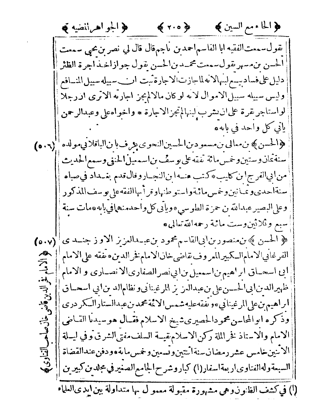 507 - الْحسن بن مَنْصُور بن أبي الْقَاسِم مَحْمُود بن عبد الْعَزِيز الأوزجندي الفرغاني الإِمَام الْكَبِير الْمَعْرُوف بقاضي خَان الإِمَام فَخر الدّين تفقه على الإِمَام أبي إِسْحَاق إِبْرَاهِيم بن إِسْمَعِيل بن أبي نصر الصفاري الْأنْصَارِيّ وَالْإِمَام ظهير الدّين أبي الْحسن عَليّ بن عبد الْعَزِيز المرغيناني ونظام الدّين أبي إِسْحَاق إِبْرَاهِيم بن عَليّ المرغيناني تفقه عَلَيْهِ شمس الْأَئِمَّة مُحَمَّد بن عبد الستار الكردري وَذكره أَبُو المحاسن مَحْمُود الحصيري شيخ الْإِسْلَام قَالَ هُوَ سيدنَا القَاضِي الإِمَام والأستاذ فَخر الْملَّة ركن الْإِسْلَام نقيه السّلف مفتي الشرق توفّي لَيْلَة الْإِثْنَيْنِ خَامِس عشر رَمَضَان سنة اثْنَتَيْنِ وَتِسْعين وَخمْس مائَة وَدفن عِنْد الْقُضَاة السَّبْعَة وَله الفتاوي أَرْبَعَة أسفار كبار وَشرح الْجَامِع الصَّغِير فى مجلدين كبيرين