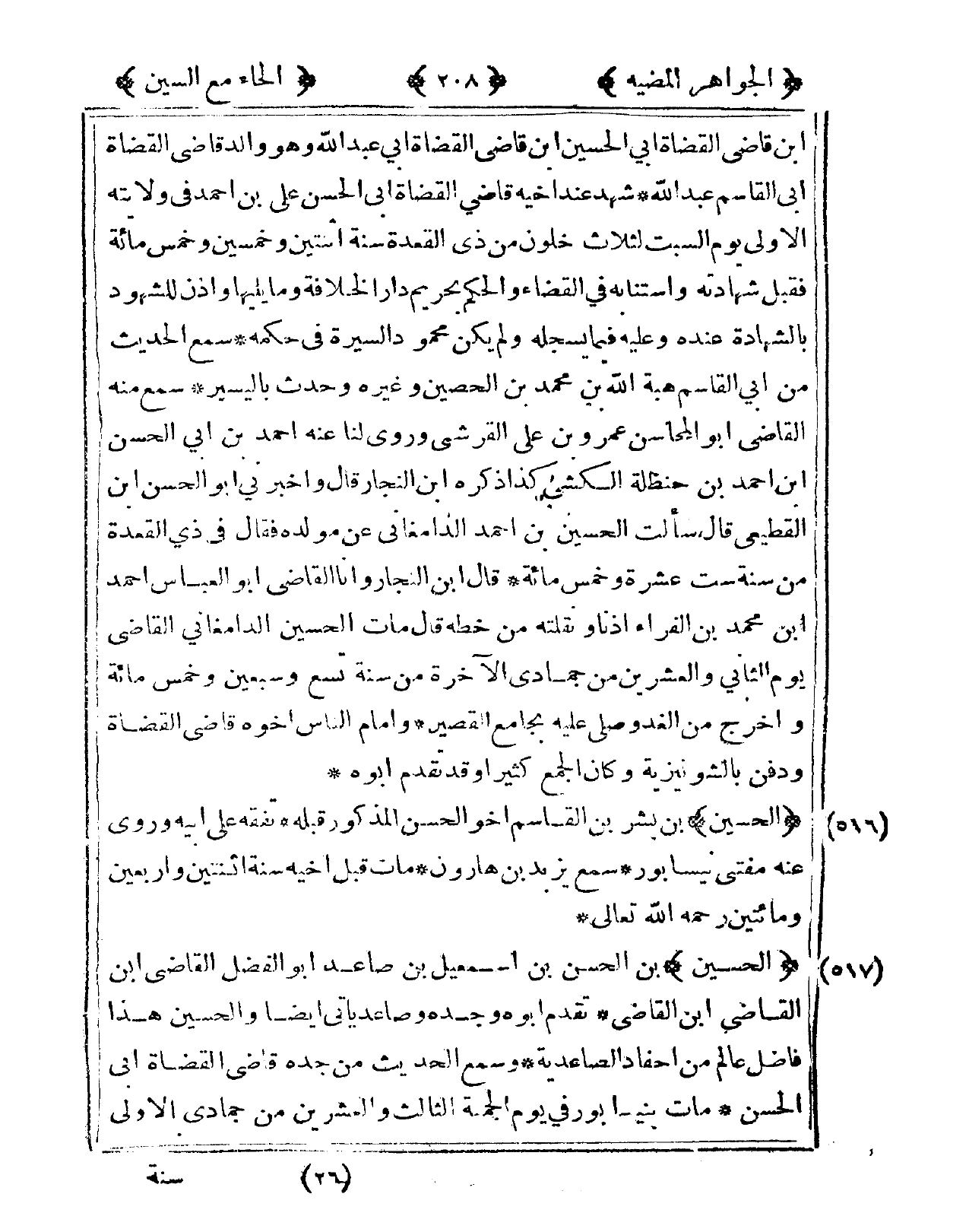517 - الْحُسَيْن بن الْحسن بن إِسْمَعِيل بن صاعد أَبُو الْفضل القَاضِي ابْن القَاضِي ابْن القَاضِي تقدم أَبوهُ وجده وصاعد يَأْتِي أَيْضا وَالْحُسَيْن هَذَا فَاضل عَالم من أحفاد الصاعدية وَسمع الحَدِيث من جده قَاضِي الْقُضَاة أبي الْحسن مَاتَ بنيسابور فى يَوْم الْجُمُعَة الثَّالِث وَالْعِشْرين من جمادي الأولى