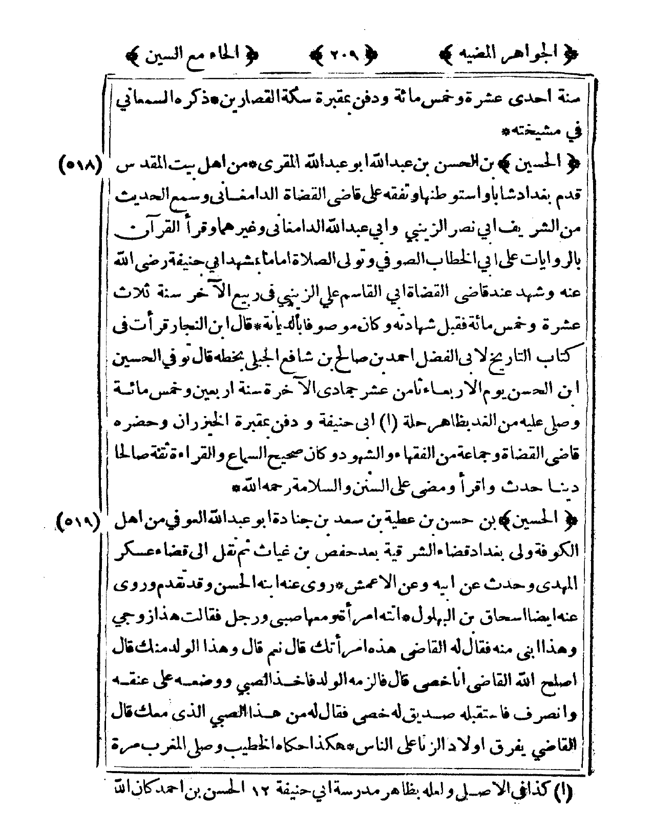 518 - الْحُسَيْن بن الْحسن بن عبد الله أَبُو عبد الله الْمقري من أهل بَيت الْمُقَدّس قدم بَغْدَاد شَابًّا واستوطنها وتفقه على قَاضِي الْقُضَاة الدَّامغَانِي وَسمع الحَدِيث من الشريف أبي نصر الزَّيْنَبِي وَأبي عبد الله الدَّامغَانِي وَغَيرهمَا وَقَرَأَ الْقُرْآن بالروايات على أبي الْخطاب الصُّوفِي وَتَوَلَّى الصَّلَاة إِمَامًا بمشهد أبي حنيفَة رَضِي الله عَنهُ وَشهد عِنْد قَاضِي الْقُضَاة أبي الْقَاسِم عَليّ الزَّيْنَبِي فى ربيع الآخر سنة ثَلَاث عشرَة وَخمْس مائَة فَقبل شَهَادَته وَكَانَ مَوْصُوفا بالديانة قَالَ ابْن النجار قَرَأت فى كتاب التَّارِيخ لأبي الْفضل أَحْمد بن صَالح بن شَافِع الْجبلي بِخَطِّهِ قَالَ توفّي الْحُسَيْن ابْن الْحسن يَوْم الْأَرْبَعَاء ثامن عشر جمادي الْآخِرَة سنة أَرْبَعِينَ وَخمْس مائَة وَصلى عَلَيْهِ من الْغَد بِظَاهِر حلَّة أبي حنيفَة وَدفن بمقبرة الخيزران وحضره قَاضِي الْقُضَاة وَجَمَاعَة من الْفُقَهَاء وَالشُّهُود وَكَانَ صَحِيح السماع وَالْقِرَاءَة ثِقَة صَالحا دينا حدث واقرأ وَمضى على السّنَن والسلامة رَحمَه الله