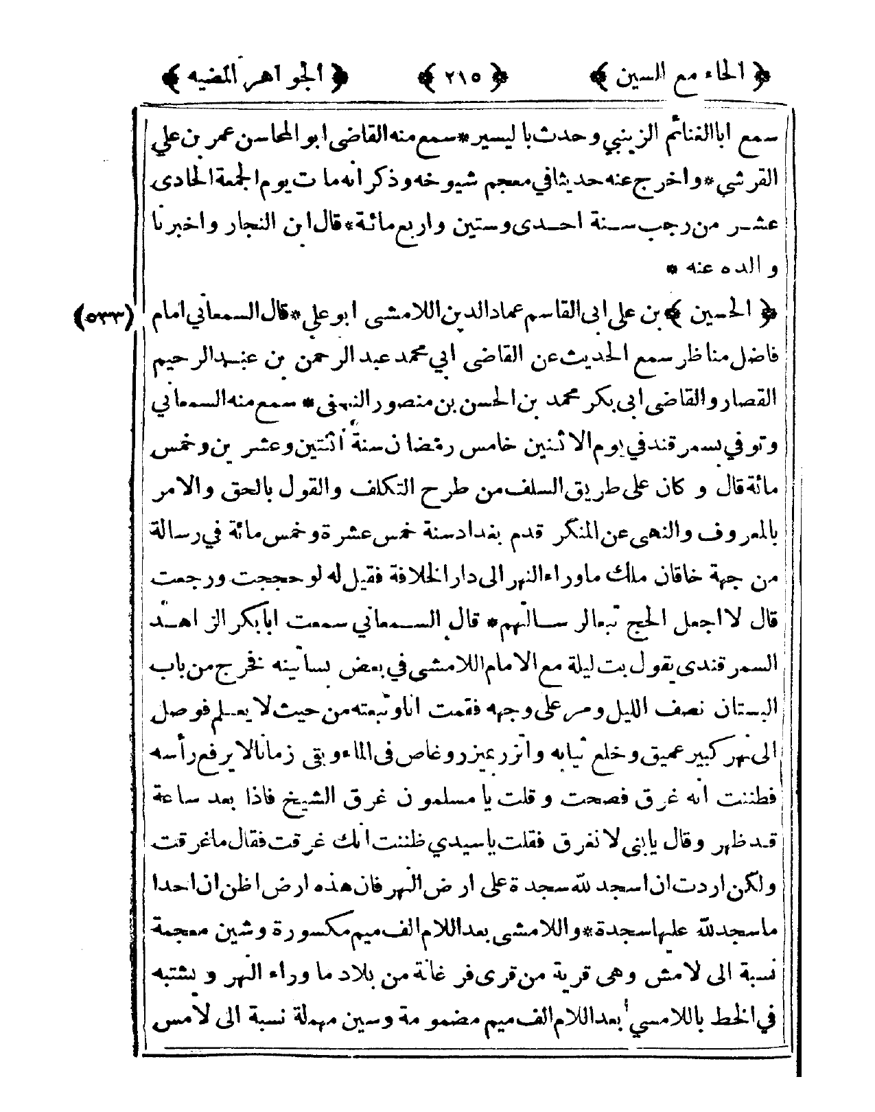 533 - الْحُسَيْن بن عَليّ أبي الْقَاسِم عماد الدّين اللامشي أَبُو عَليّ قَالَ السَّمْعَانِيّ إِمَام فَاضل مناظر سمع الحَدِيث عَن القَاضِي أبي مُحَمَّد عبد الرَّحْمَن بن عبد الرَّحِيم الْقصار وَالْقَاضِي أبي بكر مُحَمَّد بن الْحسن بن مَنْصُور النَّسَفِيّ سمع مِنْهُ السَّمْعَانِيّ وَتُوفِّي بسمرقند فى يَوْم الْإِثْنَيْنِ خَامِس رَمَضَان سنة اثْنَتَيْنِ وَعشْرين وَخمْس مائَة قَالَ وَكَانَ على طَرِيق السّلف من طرح التَّكَلُّف وَالْقَوْل بِالْحَقِّ وَالْأَمر بِالْمَعْرُوفِ وَالنَّهْي عَن الْمُنكر قدم بَغْدَاد سنة خمس عشرَة وَخمْس مائَة فى رِسَالَة من جِهَة خاقَان ملك مَا وَرَاء النَّهر إِلَى دَار الْخلَافَة فَقيل لَهُ لَو حججْت وَرجعت قَالَ لَا أجعَل الْحَج تبعا لرسالتهم قَالَ السَّمْعَانِيّ سَمِعت أَبَا بكر الزَّاهِد السَّمرقَنْدِي يَقُول بت لَيْلَة من الإِمَام اللامشي فى بعض بساتينه فَخرج من بَاب الْبُسْتَان نصف اللَّيْل وَمر على وَجهه فَقُمْت أَنا وتبعته من حَيْثُ لَا يعلم فوصل إِلَى نهر كَبِير عميق وخلع ثِيَابه وأتزر بميزر وغاص فى المَاء وَبَقِي زَمَانا لَا يرفع رَأسه فَظَنَنْت أَنه غرق فَصحت وَقلت يَا مُسلمُونَ غرق الشَّيْخ فَإِذا بعد سَاعَة قد ظهر وَقَالَ يَا بني لَا نغرق فَقلت يَا سَيِّدي ظَنَنْت أَنَّك غرقت فَقَالَ مَا غرقت وَلَكِن أردْت أَن أَسجد لله سَجْدَة على أَرض النَّهر فَإِن هَذِه أَرض أَظن أَن أحدا مَا سجد لله عَلَيْهَا سَجْدَة واللامشي بعد اللَّام ألف مِيم مَكْسُورَة وشين مُعْجمَة نِسْبَة إِلَى لامش وهى قَرْيَة من قرى فرغانة من بِلَاد مَا وَرَاء النَّهر وَيشْتَبه فى الْخط باللامسي بعد اللَّام ألف مِيم مَضْمُومَة وسين مُهْملَة نِسْبَة إِلَى لامس
