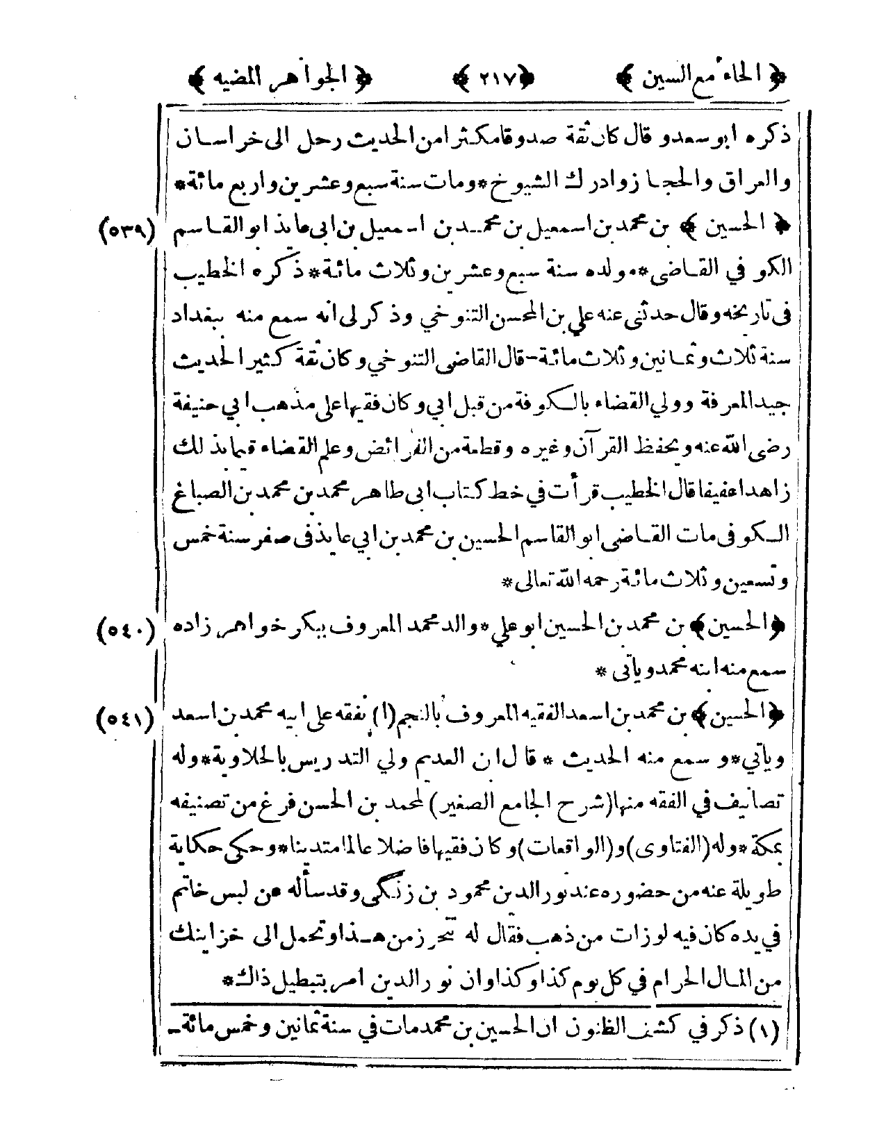 541 - الْحُسَيْن بن مُحَمَّد بن أسعد الْفَقِيه الْمَعْرُوف بِالنَّجْمِ تفقه على أَبِيه مُحَمَّد بن أسعد وَيَأْتِي وَسمع مِنْهُ الحَدِيث قَالَ ابْن العديم ولي التدريس بالحلاوية وَله تصانيف فى الْفِقْه مِنْهَا شرح الْجَامِع الصَّغِير لمُحَمد بن الْحسن فرغ من تصنيفه بِمَكَّة وَله الفتاوي والواقعات وَكَانَ فَقِيها فَاضلا عَالما متدينا وَحكى حِكَايَة طَوِيلَة عَنهُ من حُضُوره عِنْد نور الدّين مَحْمُود بن زنكي وَقد سَأَلَهُ عَن لبس خَاتم فى يَده كَانَ فِيهِ لوزات من ذهب فَقَالَ لَهُ تتحرز من هَذَا وَتحمل إِلَى خزاينك من المَال الْحَرَام فى كل يَوْم كَذَا وَكَذَا وَإِن نور الدّين أَمر بتبطيل ذَلِك