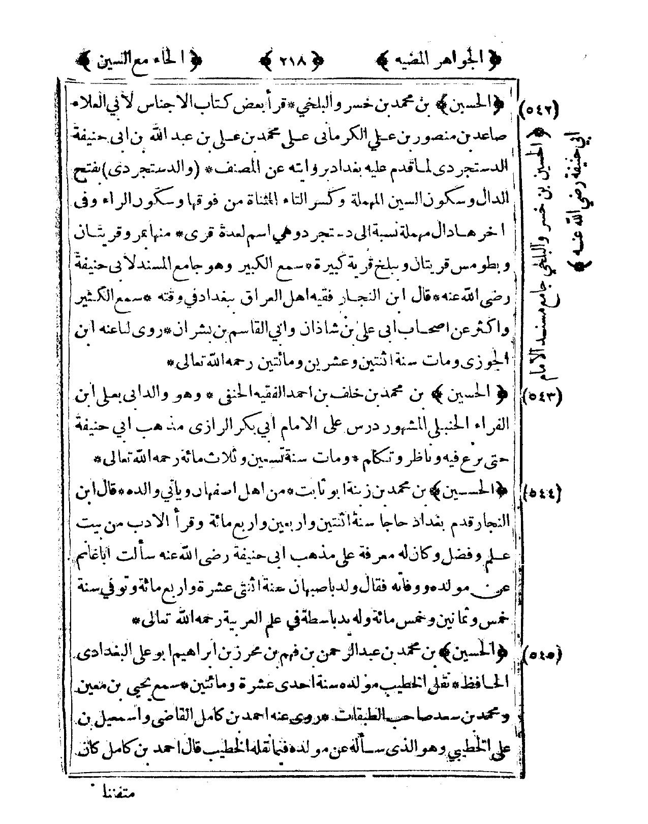 542 - الْحُسَيْن بن مُحَمَّد بن خسرو الْبَلْخِي قَرَأَ بعض كتاب الْأَجْنَاس لأبي الْعَلَاء صاعد بن مَنْصُور بن عَليّ الْكرْمَانِي على مُحَمَّد بن عَليّ بن عبد الله بن أبي حنيفَة الدستجردي لما قدم عَلَيْهِ بَغْدَاد بروايته عَن الْمنصف والدستجردي بِفَتْح الدَّال وَسُكُون السِّين الْمُهْملَة وَكسر التَّاء الْمُثَنَّاة من فَوْقهَا وَسُكُون الرَّاء وفى آخرهَا دَال مُهْملَة نِسْبَة إِلَى دستجرد وهى اسْم لعدة قرى مِنْهَا بمرو قَرْيَتَانِ وبطومس قَرْيَتَانِ وببلخ قَرْيَة كَبِيرَة سمع الْكَبِير وَهُوَ جَامع الْمسند لأبي حنيفَة رَضِي الله عَنهُ قَالَ ابْن النجار فَقِيه أهل الْعرَاق بِبَغْدَاد فى وقته سمع الْكثير وَأكْثر عَن أَصْحَاب أَبى عَليّ بن شَاذان وَأبي الْقَاسِم بن بَشرَان روى لنا عَنهُ ابْن الْجَوْزِيّ وَمَات سنة اثْنَتَيْنِ وَعشْرين وَمِائَتَيْنِ رَحمَه الله تَعَالَى