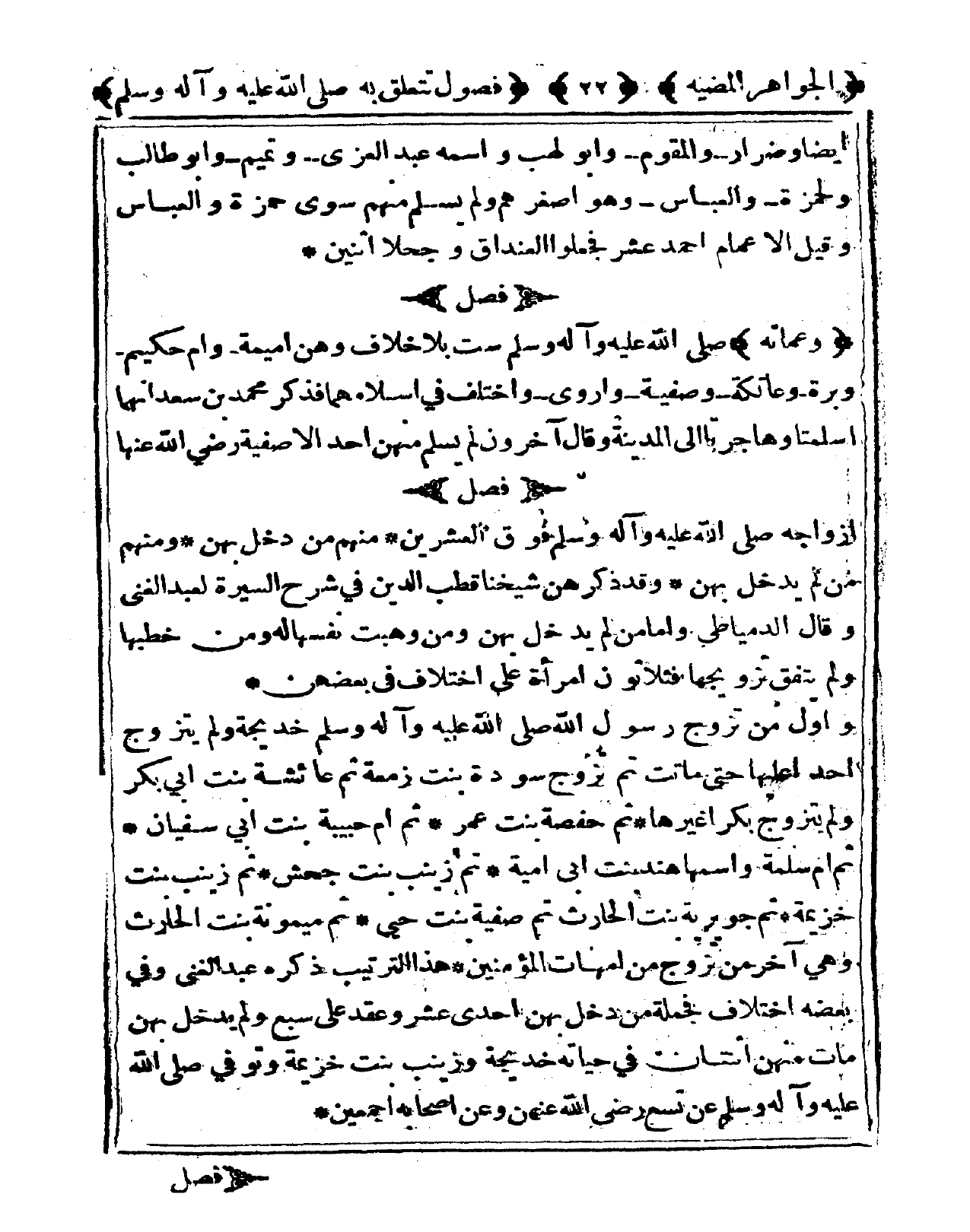 أَزوَاجه صلى الله عَلَيْهِ وَسلم فَوق الْعشْرين مِنْهُم من دخل بِهن وَمِنْهُم من لم يدْخل بِهن وَقد ذكرهن شَيخنَا قطب الدّين فى شرح السِّيرَة لعبد الْغَنِيّ وَقَالَ الدمياطي وَأما من لم يدْخل بِهن وَمن وهبت نَفسهَا لَهُ وَمن خطبهَا وَلم يتَّفق تَزْوِيجهَا فثلاثون امْرَأَة على اخْتِلَاف فى بَعضهنَّ