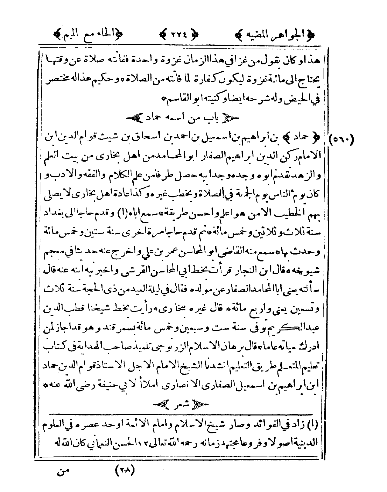 560 - حَمَّاد بن إِبْرَاهِيم بن إِسْمَعِيل بن أَحْمد بن إِسْحَاق بن شِيث قوام الدّين ابْن الإِمَام ركن الدّين إِبْرَاهِيم الصفار أَبُو المحامد من أهل بُخَارى من بَيت الْعلم والزهد تقدم أَبوهُ وجده وجد أَبِيه حصل طرفا من علم الْكَلَام وَالْفِقْه وَالْأَدب وَكَانَ يؤم النَّاس يَوْم الْجُمُعَة فى الصَّلَاة ويخطب غَيره وَكَذَا عَادَة أهل بُخَارى لَا يُصَلِّي بهم الْخَطِيب إِلَّا من هُوَ أعلم وَأحسن طَريقَة سمع أَبَاهُ وَقدم حَاجا إِلَى بَغْدَاد سنة ثَلَاث وَثَلَاثِينَ وَخمْس مائَة ثمَّ قدم حَاجا مرّة أُخْرَى سنة سِتِّينَ وَخمْس مائَة وَحدث بهَا سمع مِنْهُ القَاضِي أَبُو المحاسن عمر بن عَليّ وَأخرج عَنهُ حَدِيثا فى مُعْجم شُيُوخه قَالَ ابْن النجار قَرَأت بِخَط أَبى المحاسن الْقرشِي وأخبرنيه ابْنه عَنهُ قَالَ سَأَلته يَعْنِي أَبَا المحامد الصفار عَن مولده فَقَالَ فى لَيْلَة الْعِيد من ذِي الْحجَّة سنة ثَلَاث وَتِسْعين يَعْنِي وَأَرْبع مائَة قَالَ غَيره ببخارى رَأَيْت بِخَط شَيخنَا قطب الدّين عبد الْكَرِيم وفى سنة سِتّ وَسبعين وَخمْس مائَة بسمرقند وَهُوَ قد أجَاز لمن أدْرك حَيَاته عَاما قَالَ برهَان الْإِسْلَام الزرنوجي تلميذ صَاحب الْهِدَايَة فى كتاب تَعْلِيم المتعلم طَرِيق التَّعْلِيم أنشدنا الشَّيْخ الإِمَام الْأَجَل الْأُسْتَاذ قوام الدّين حَمَّاد ابْن إِبْرَاهِيم بن إِسْمَعِيل الصفاري الْأنْصَارِيّ أملأا لأبي حنيفَة رَضِي الله عَنهُ شعر
