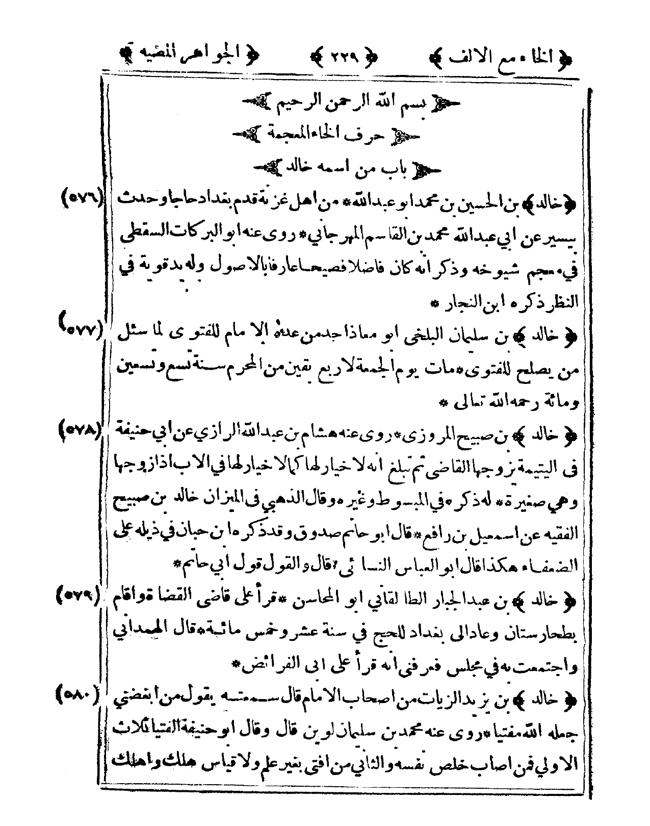 579 - خَالِد بن عبد الْجَبَّار الطَّالقَانِي أَبُو المحاسن قَرَأَ على قَاضِي الْقُضَاة وَأقَام بطخارستان وَعَاد إِلَى بَغْدَاد لِلْحَجِّ فى سنة عشر وَخمْس مائَة قَالَ الْهَمدَانِي وَاجْتمعت بِهِ فى مجْلِس فعرفني أَنه قَرَأَ على أبي الْفَرَائِض
