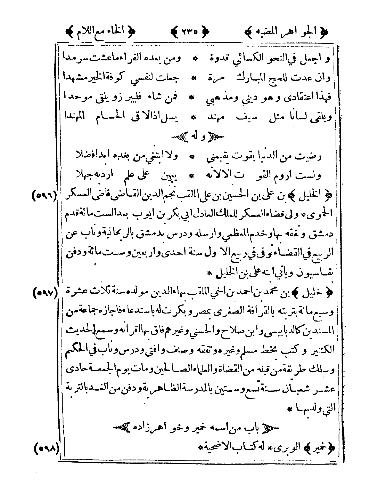 596 - الْخَلِيل بن عَليّ بن الْحُسَيْن بن عَليّ الملقب نجم الدّين القَاضِي قَاضِي الْعَسْكَر الْحَمَوِيّ ولي قَضَاء الْعَسْكَر للْملك الْعَادِل أَبى بكر بن أَيُّوب بعد السِّت مائَة قدم دمشق وتفقه بهَا وخدم المعظمي وأرسله ودرس بِدِمَشْق بالريحانية وناب عَن الرّبيع فى الْقَضَاء توفّي فى ربيع الأول سنة إِحْدَى وَأَرْبَعين وست مائَة وَدفن بقاسيون وَيَأْتِي ابْنه عَليّ بن الْخَلِيل