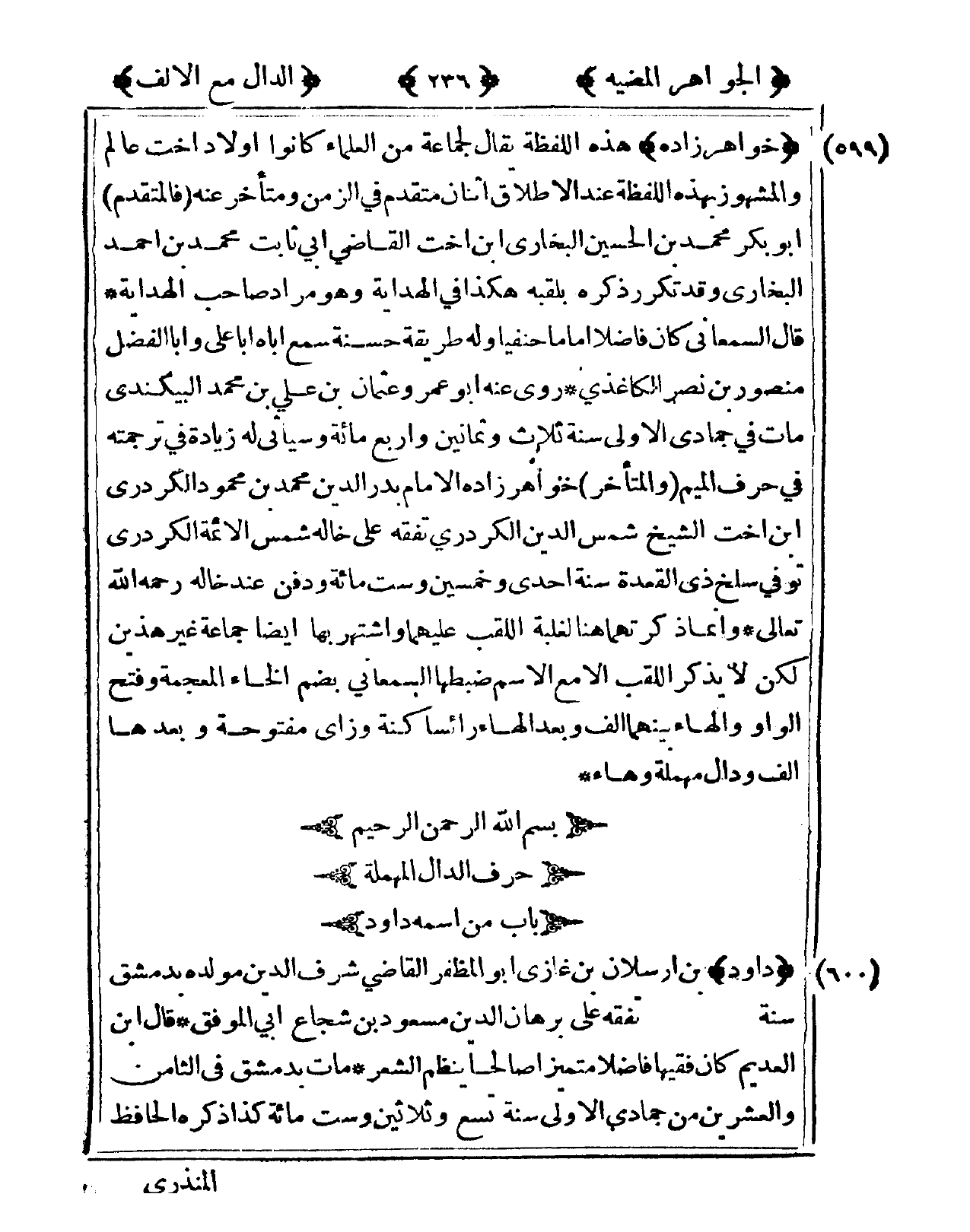 599 - خواهرزاده هَذِه اللَّفْظَة يُقَال لجَماعَة من الْعلمَاء كَانُوا أَوْلَاد أُخْت عَالم وَالْمَشْهُور بِهَذِهِ اللَّفْظَة عِنْد الْإِطْلَاق اثْنَان مُتَقَدم فى الزَّمن ومتأخر عَنهُ فالمتقدم أَبُو بكر مُحَمَّد بن الْحُسَيْن البُخَارِيّ ابْن أُخْت القَاضِي أبي ثَابت مُحَمَّد بن حُسَيْن البُخَارِيّ وَقد تكَرر ذكره بلقبه هَكَذَا فى الْهِدَايَة وَهُوَ مُرَاد صَاحب الْهِدَايَة قَالَ السَّمْعَانِيّ كَانَ فَاضلا إِمَامًا حنفيا وَله طَريقَة حَسَنَة سمع أَبَاهُ أيا عَليّ وَأَبا الْفضل مَنْصُور بن نصر الكاغذي روى عَنهُ أَبُو عمر وَعُثْمَان بن عَليّ بن مُحَمَّد البيكندي مَاتَ فى جمادي الأولى سنة ثَلَاث وَثَمَانِينَ وَأَرْبع مائَة وَسَيَأْتِي لَهُ زِيَادَة فى تَرْجَمته فى حرف الْمِيم والمتأخر خواهرزاده الإِمَام بدر الدّين مُحَمَّد بن مَحْمُود الكردري ابْن أُخْت الشَّيْخ شمس الدّين الكردري تفقه على خَاله شمس الْأَئِمَّة الكردري توفّي سلخ ذِي الْقعدَة سنة إِحْدَى وَخمسين وست مائَة وَدفن عِنْد خَاله رَحمَه الله تَعَالَى وَإِنَّمَا ذكرتهما هُنَا لغَلَبَة اللقب عَلَيْهِمَا واشتهر بهَا أَيْضا جمَاعَة غير هذَيْن لَكِن لَا يذكر اللقب إِلَّا مَعَ الِاسْم ضَبطهَا السَّمْعَانِيّ بِضَم الْخَاء الْمُعْجَمَة وَفتح الْوَاو وَالْهَاء بَينهمَا ألف وَبعد الْهَاء رَاء سَاكِنة وزاي مَفْتُوحَة وَبعدهَا ألف ودال مُهْملَة وهاء بِسم الله الرَّحْمَن الرَّحِيم