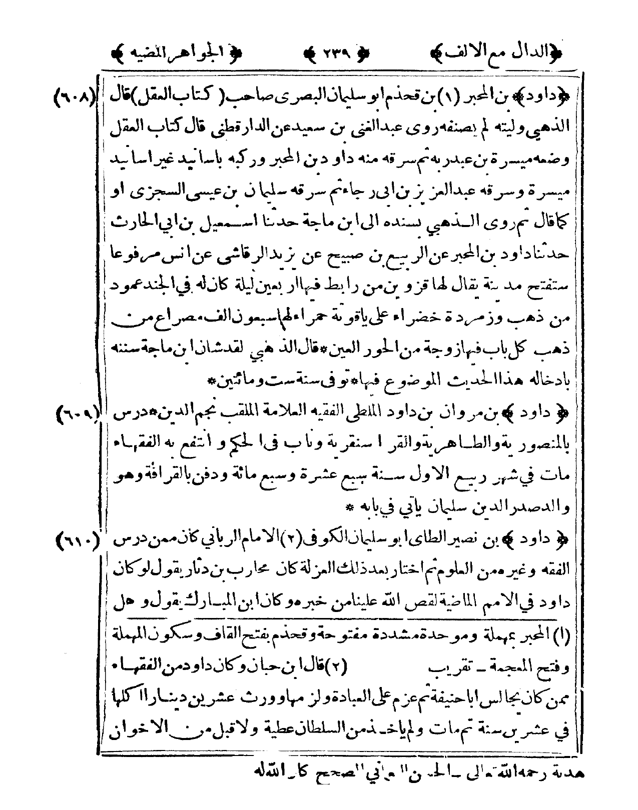 608 - دَاوُد بن المحبر بن قحذم أَبُو سُلَيْمَان الْبَصْرِيّ صَاحب كتاب الْعقل قَالَ الذَّهَبِيّ وليته لم يصنفه روى عبد الْغَنِيّ بن سعيد عَن الدَّارَقُطْنِيّ قَالَ كتاب الْعقل وَضعه ميسرَة بن عبد ربه ثمَّ سَرقه مِنْهُ دَاوُد بن المحبر وَركبهُ بأسانيد غير أَسَانِيد ميسرَة وَسَرَقَهُ عبد الْعَزِيز بن أبي رَجَاء ثمَّ سَرقه سُلَيْمَان بن عِيسَى السجْزِي أَو كَمَا قَالَ ثمَّ روى الذَّهَبِيّ بِسَنَدِهِ إِلَى ابْن ماجة حَدثنَا إِسْمَعِيل بن أَبى الْحَارِث حَدثنَا دَاوُد بن المحبر عَن الرّبيع بن صبيح عَن يزِيد الرقاشِي عَن أنس مَرْفُوعا ستفتح مَدِينَة يُقَال لَهَا قزوين من رابط فِيهَا أَرْبَعِينَ لَيْلَة كَانَ لَهُ فى الْجنَّة عَمُود من ذهب وزمردة خضراء على ياقوتة حَمْرَاء لَهَا سَبْعُونَ ألف مصراع من ذهب كل بَاب فِيهَا زَوْجَة من الْحور الْعين قَالَ الذَّهَبِيّ لقدشان ابْن ماجة سنَنه بإدخاله هَذَا الحَدِيث الْمَوْضُوع فِيهَا توفّي سنة سِتّ وَمِائَتَيْنِ