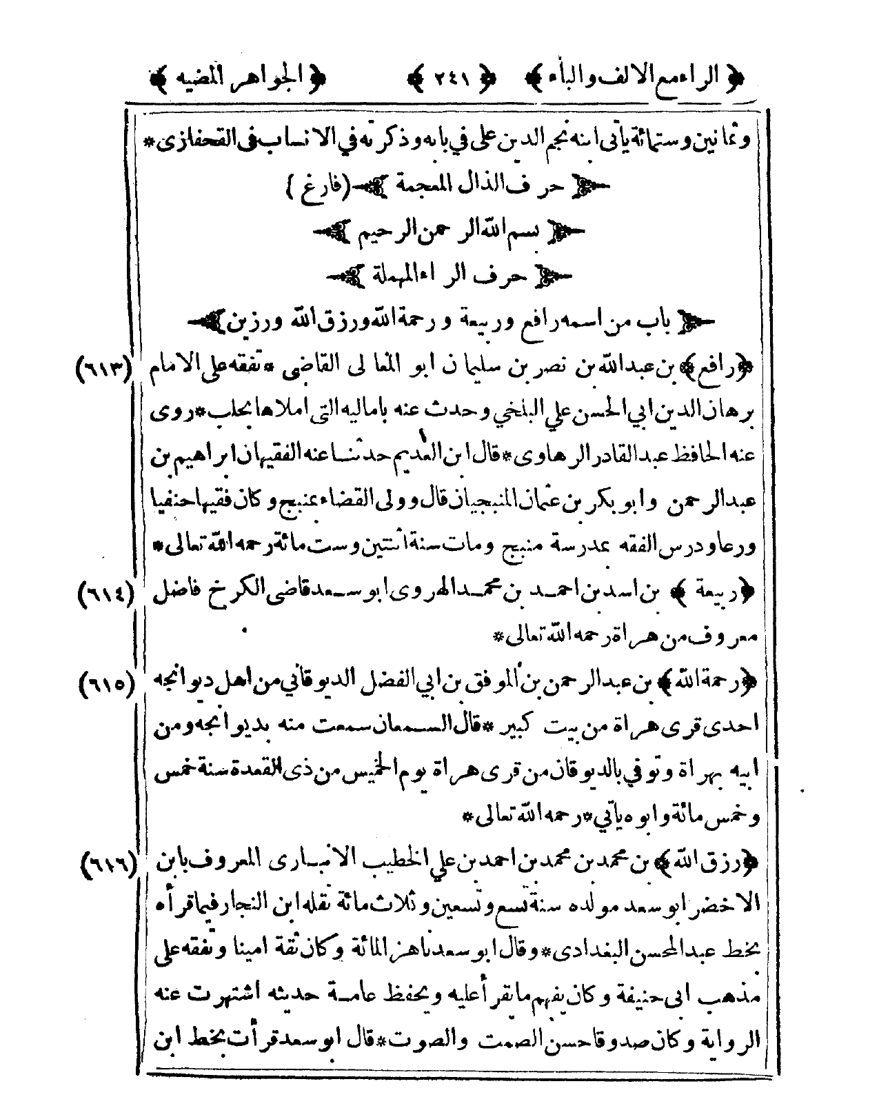 613 - رَافع بن عبد الله بن نصر بن سُلَيْمَان أَبُو الْمَعَالِي القَاضِي تفقه على الإِمَام برهَان الدّين أبي الْحسن عَليّ الْبَلْخِي وَحدث عَنهُ بإماليه الَّتِى أملأها بحلب روى عَنهُ الْحَافِظ عبد الْقَادِر الرهاوي قَالَ ابْن العديم حَدثنَا عَن الفقيهان إِبْرَاهِيم بن عبد الرَّحْمَن وَأَبُو بكر بن عُثْمَان المنبجيان قَالَ وَولى الْقَضَاء بمنبج وَكَانَ فَقِيها حنفيا ورعا ودرس الْفِقْه بمدرسة منبج وَمَات سنة اثْنَتَيْنِ وست مائَة رَحمَه الله تَعَالَى