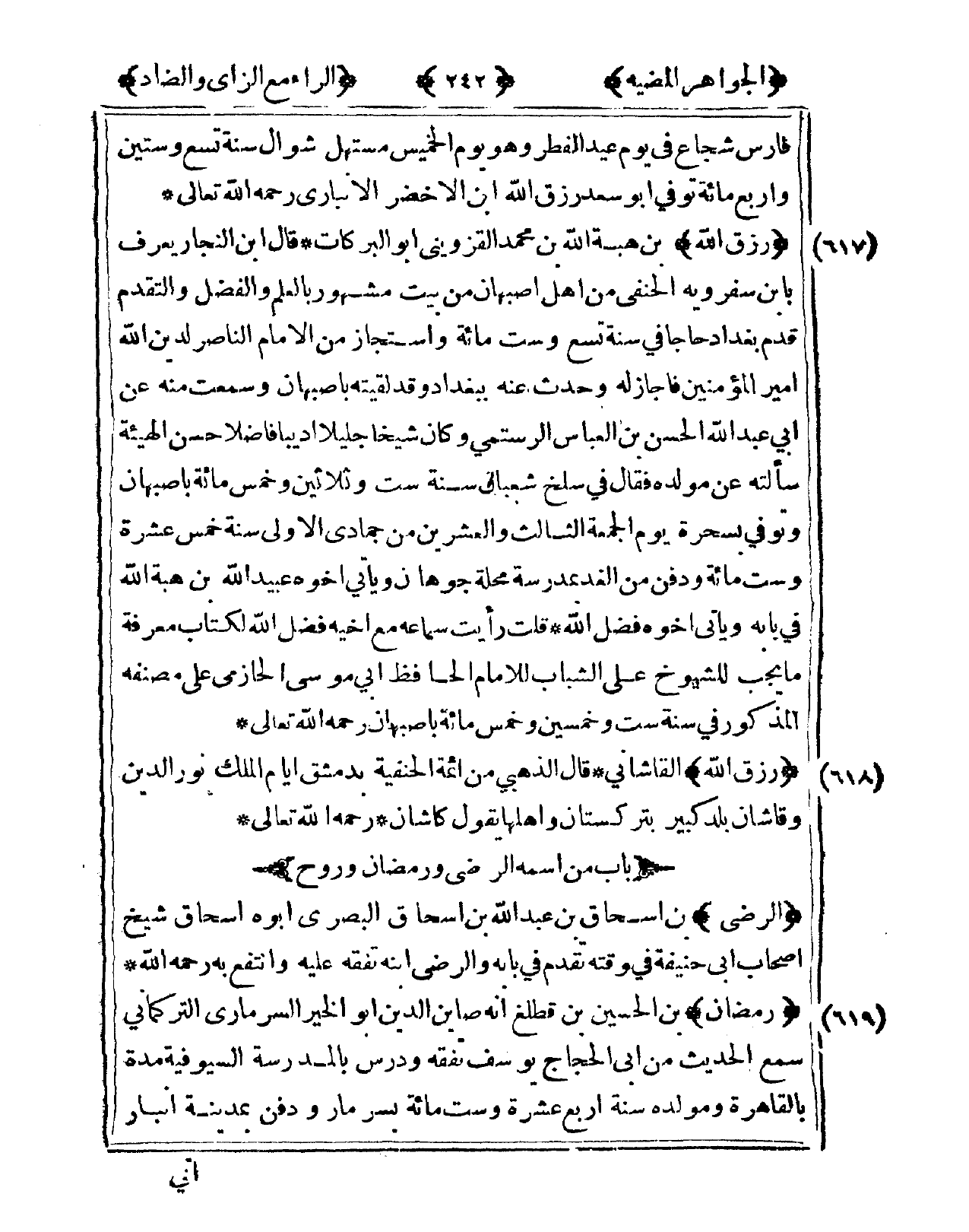 618 - رزق الله القاشاني قَالَ الذَّهَبِيّ من أَئِمَّة الْحَنَفِيَّة بِدِمَشْق أَيَّام الْملك نور الدّين وقاشان بلد كَبِير بتركستان وَأَهْلهَا يَقُول كاشان رَحمَه الله تَعَالَى