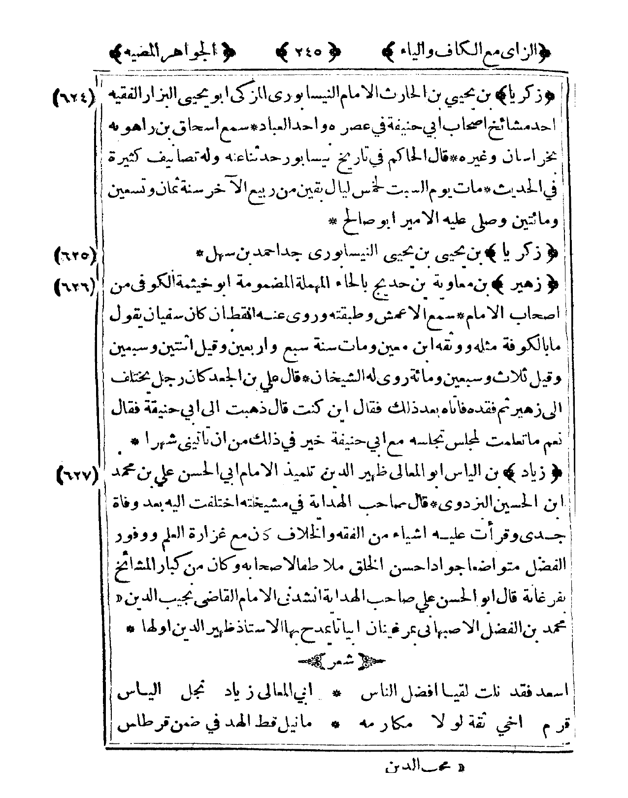 627 - زِيَاد بن إلْيَاس أَبُو الْمَعَالِي ظهير الدّين تلميذ الإِمَام أبي الْحسن عَليّ بن مُحَمَّد ابْن الْحُسَيْن الْبَزْدَوِيّ قَالَ صَاحب الْهِدَايَة فى مشيخته اخْتلفت إِلَيْهِ بعد وَفَاة جدي وَقَرَأَ عَلَيْهِ أَشْيَاء من الْفِقْه وَالْخلاف كَانَ مَعَ غزارة الْعلم ووفور الْفضل متوضعا جوادا حسن الْخلق ملاطفا لأَصْحَابه وَكَانَ من كبار المشائخ بفرغانة قَالَ أَبُو الْحسن عَليّ صَاحب الْهِدَايَة أَنْشدني الإِمَام القَاضِي نجيب الدّين مُحَمَّد بن الْفضل الْأَصْبَهَانِيّ بمرغينان أبياتا يمدح بهَا الْأُسْتَاذ ظهير الدّين أَولهَا شعر ... أسعد فقد نلْت لقيا أفضل النَّاس ... أبي الْمَعَالِي زِيَاد نجل إلْيَاس