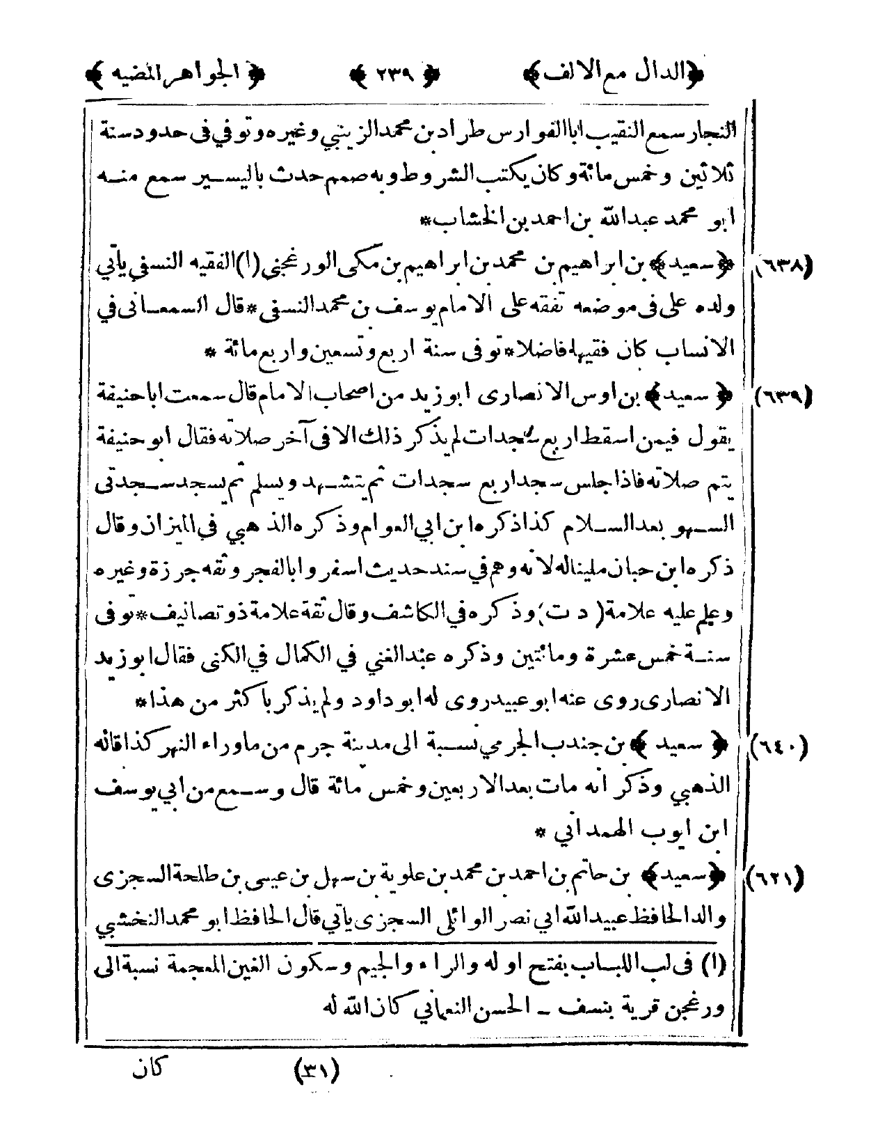 638 - سعيد بن إِبْرَاهِيم بن مُحَمَّد بن إِبْرَاهِيم بن مكي الورغجني الْفَقِيه النَّسَفِيّ يَأْتِي وَلَده عَليّ فى مَوْضِعه تفقه على الإِمَام يُوسُف بن مُحَمَّد النَّسَفِيّ قَالَ السَّمْعَانِيّ فى الْأَنْسَاب كَانَ فَقِيها فَاضلا توفّي سنة أَربع وَتِسْعين وَأَرْبع مائَة