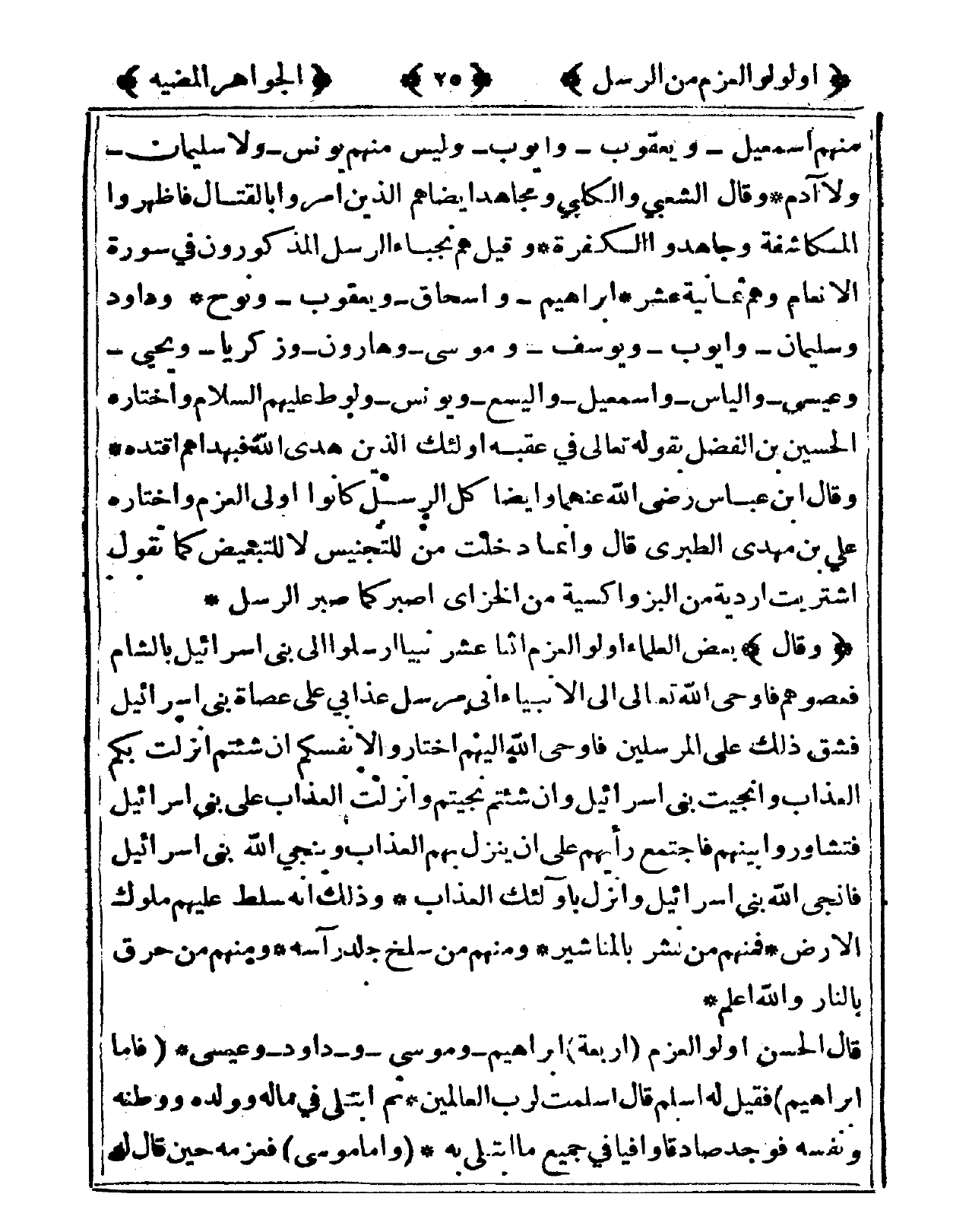 مِنْهُم إِسْمَعِيل وَيَعْقُوب وَأَيوب وَلَيْسَ مِنْهُم يُونُس وَلَا سُلَيْمَان وَلَا آدم وَقَالَ الشّعبِيّ والكلبي وَمُجاهد أَيْضا هم الَّذين أمروا بِالْقِتَالِ فأظهروا المكاشفة وَجَاهدُوا الْكَفَرَة وَقيل هم نجباء الرُّسُل المذكورون فى سُورَة الْأَنْعَام وهم ثَمَانِيَة عشر إِبْرَاهِيم وَإِسْحَاق وَيَعْقُوب ونوح وَدَاوُد وَسليمَان وَأَيوب ويوسف ومُوسَى وَهَارُون وزَكَرِيا وَيحيى وَعِيسَى وإلياس وَإِسْمَاعِيل وَالْيَسع وَيُونُس وَلُوط عَلَيْهِم السَّلَام وَاخْتَارَهُ الْحُسَيْن بن الْفضل بقوله تَعَالَى فى عقبه {أُولَئِكَ الَّذين هدى الله فبهداهم اقتده} وَقَالَ ابْن عَبَّاس رضى الله عَنْهُمَا وَأَيْضًا كل الرُّسُل كَانُوا ألوا الْعَزْم وَاخْتَارَهُ عَليّ بن مهْدي الطَّبَرِيّ قَالَ وَإِنَّمَا دخلت من للتجنيس لَا للتَّبْعِيض كَمَا تَقول اشْتريت أردية من البزواكسية من الخزاي اصبر كَمَا صَبر الرُّسُل