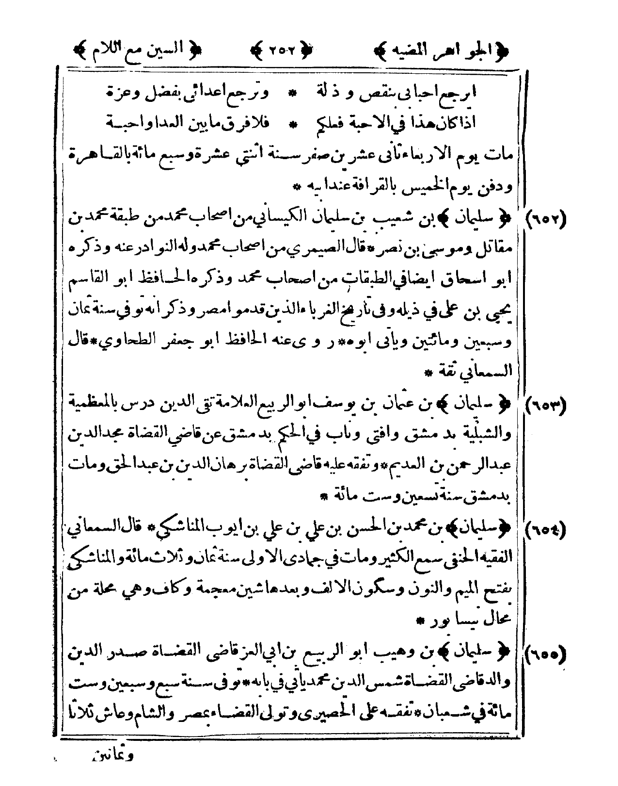 653 - سُلَيْمَان بن عُثْمَان بن يُوسُف أَبُو الرّبيع الْعَلامَة تَقِيّ الدّين درس بالمعظمية والشبلية بِدِمَشْق وَأفْتى وناب فى الحكم بِدِمَشْق عَن قَاضِي الْقُضَاة مجد الدّين عبد الرَّحْمَن بن العديم وتفقه عَلَيْهِ قَاضِي الْقُضَاة برهَان الدّين بن عبد الْحق وَمَات بِدِمَشْق سنة تسعين وست مائَة