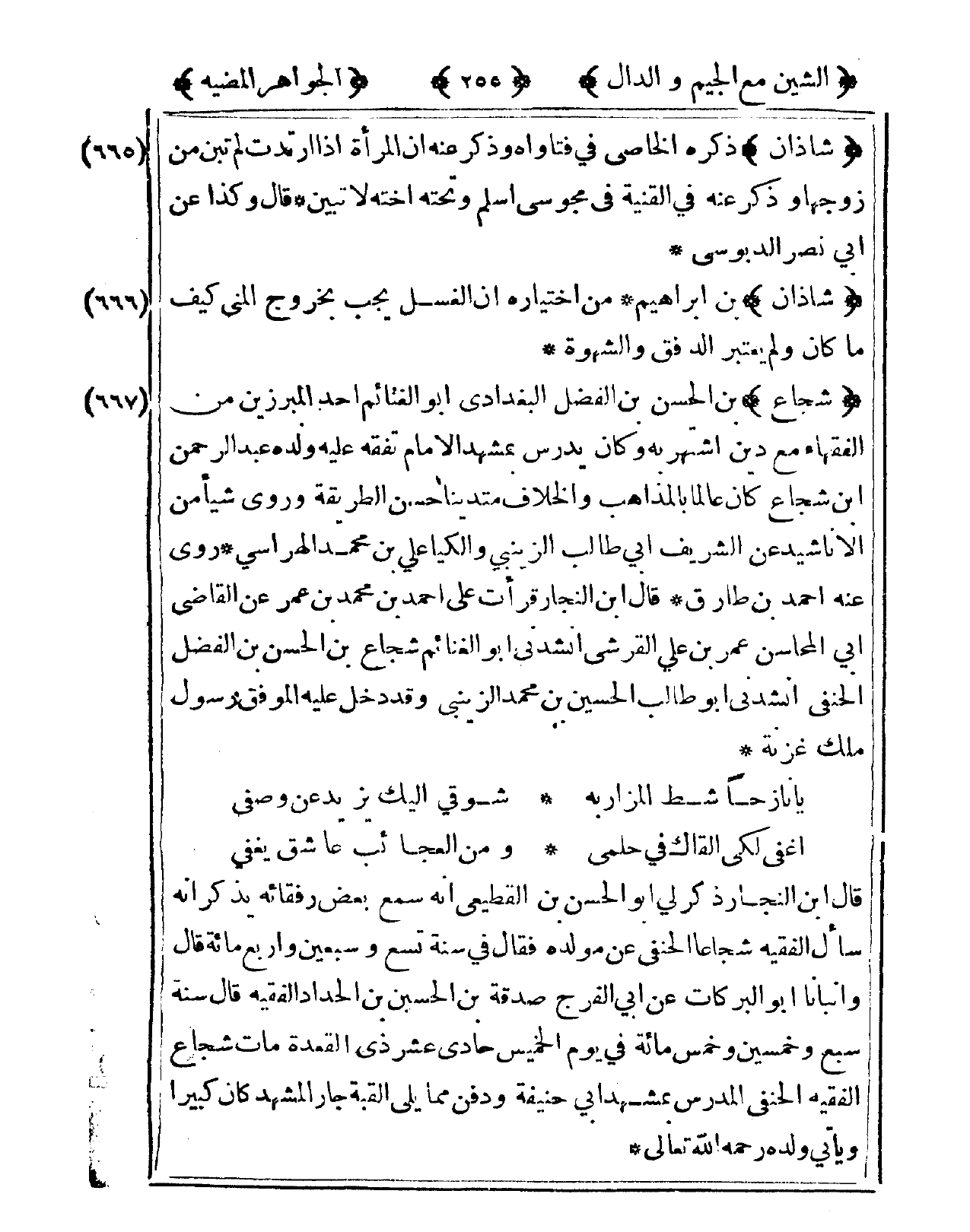 667 - شُجَاع بن الْحسن بن الْفضل الْبَغْدَادِيّ أَبُو الْغَنَائِم أحد المبرزين من الْفُقَهَاء مَعَ دين اشْتهر بِهِ وَكَانَ يدرس بمشهد الْأَمَام تفقه عَلَيْهِ وَلَده عبد الرَّحْمَن ابْن شُجَاع كَانَ عَالما بالمذاهب وَالْخلاف متدينا حسن الطَّرِيقَة وروى شَيْئا من الأناشيد عَن الشريف أبي طَالب الزَّيْنَبِي والكيا عَليّ بن مُحَمَّد الهراسي روى عَنهُ أَحْمد بن طَارق قَالَ ابْن النجار قَرَأت على أَحْمد بن مُحَمَّد بن عمر عَن القَاضِي أبي المحاسن عمر بن عَليّ الْقرشِي أَنْشدني أَبُو الْغَنَائِم شُجَاع بن الْحسن بن الفضب الْحَنَفِيّ أَنْشدني أَبُو طَالب الْحُسَيْن بن مُحَمَّد الزَّيْنَبِي وَقد دخل عَلَيْهِ الْمُوفق رَسُول ملك غزنة ... يَا نازحا شط المزاربه ... شوقي إِلَيْك يزِيد عَن وصفي