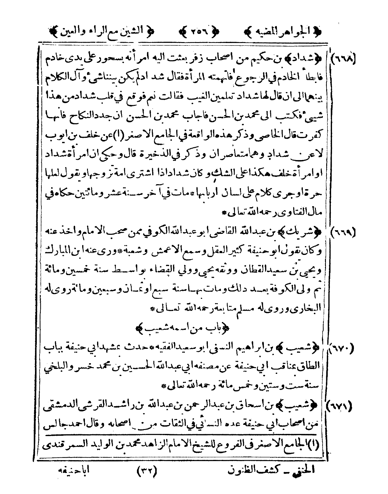 668 - شَدَّاد بن حَكِيم من أَصْحَاب زفر بعثت إِلَيْهِ امْرَأَته بسحور على يَدي خَادِم فَأَبْطَأَ الْخَادِم فى الرُّجُوع فاتهمته الْمَرْأَة فَقَالَ شَدَّاد لم يكن بَيْننَا شَيْء وَآل الْكَلَام بَينهمَا إِلَى أَن قَالَ لَهَا شَدَّاد تعلمين الْغَيْب فَقَالَت نعم فَوَقع فى قلب شَدَّاد من هَذَا شَيْء فَكتب إِلَى مُحَمَّد بن الْحسن فَأجَاب مُحَمَّد بن الْحسن أَن جدد النِّكَاح فَإِنَّهَا كفرت قَالَ الخاصي وَذكر هَذِه الْوَاقِعَة فى الْجَامِع الْأَصْغَر عَن خلف بن أَيُّوب لَا عَن شَدَّاد وهما متعاصران وَذكر فى الذَّخِيرَة قَالَ وَحكى أَن امْرَأَة شَدَّاد أَو امْرَأَة خلف هَكَذَا على الشَّك وَكَانَ شَدَّاد إِذا اشْترى أمة تزَوجهَا وَيَقُول لَعَلَّهَا حرَّة أَو جرى كَلَام على لِسَان أَرْبَابهَا مَاتَ فى آخر سنة عشر وَمِائَتَيْنِ حَكَاهُ فى مَال الفتاوي رَحمَه الله تَعَالَى