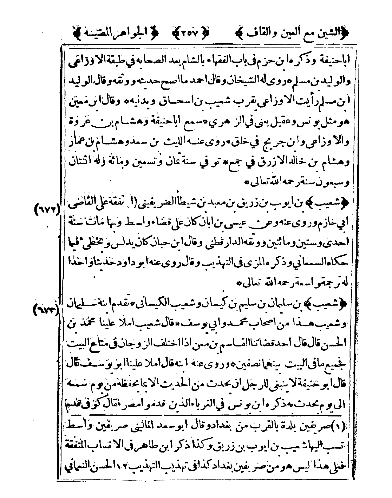 672 - شُعَيْب بن أَيُّوب بن زُرَيْق بن معبد بن شيطا الصريفيني تفقه على القَاضِي أبي خازم وروى عَنهُ وَعَن عِيسَى بن أبان كَانَ على قَضَاء وَاسِط وَبهَا مَاتَ سنة إِحْدَى وَسِتِّينَ وَمِائَتَيْنِ وَوَثَّقَهُ الدَّارَقُطْنِيّ وَقَالَ ابْن حبَان كَانَ يُدَلس ويخطئ فِيمَا حَكَاهُ السَّمْعَانِيّ وَذكره الْمزي فى التَّهْذِيب وَقَالَ روى عَنهُ أَبُو دَاوُد حَدِيثا وَاحِدًا لَهُ تَرْجَمَة وَاسِعَة رَحمَه الله تَعَالَى