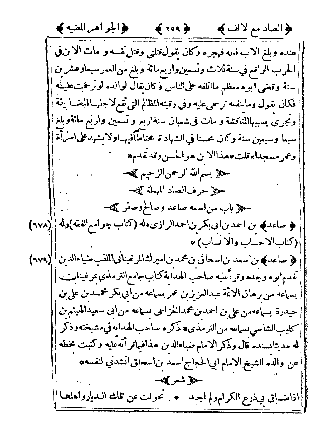 679 - صاعد بن أسعد بن إِسْحَاق بن مُحَمَّد بن أميرك المرغيناني الملقب ضِيَاء الدّين تقدم أَبوهُ وجده وَقَرَأَ عَلَيْهِ صَاحب الْهِدَايَة كتاب جَامع التِّرْمِذِيّ بمرغينان بِسَمَاعِهِ من برهَان الْأَئِمَّة عبد الْعَزِيز بن عمر بِسَمَاعِهِ من أبي بكر مُحَمَّد بن عَليّ بن حيدرة بِسَمَاعِهِ من عَليّ بن أَحْمد بن مُحَمَّد الْخُزَاعِيّ بِسَمَاعِهِ من أبي سعيد الْهَيْثَم بن كُلَيْب الشاسي بِسَمَاعِهِ من التِّرْمِذِيّ ذكره صَاحب الْهِدَايَة فى مشيخته وَذكر لَهُ حَدِيثا بِسَنَدِهِ قَالَ وَذكر الإِمَام ضِيَاء الدّين هَذَا فِيمَا قرأته عَلَيْهِ وَكتب بِخَطِّهِ عَن وَالِده الشَّيْخ الإِمَام أبي الْحجَّاج أسعد بن إِسْحَاق أَنْشدني لنَفسِهِ شعر ... إِذا ضَاقَ بِي ذرع الْكِرَام وَلم أجد ... تحولت عَن تِلْكَ الديار وَأَهْلهَا ...